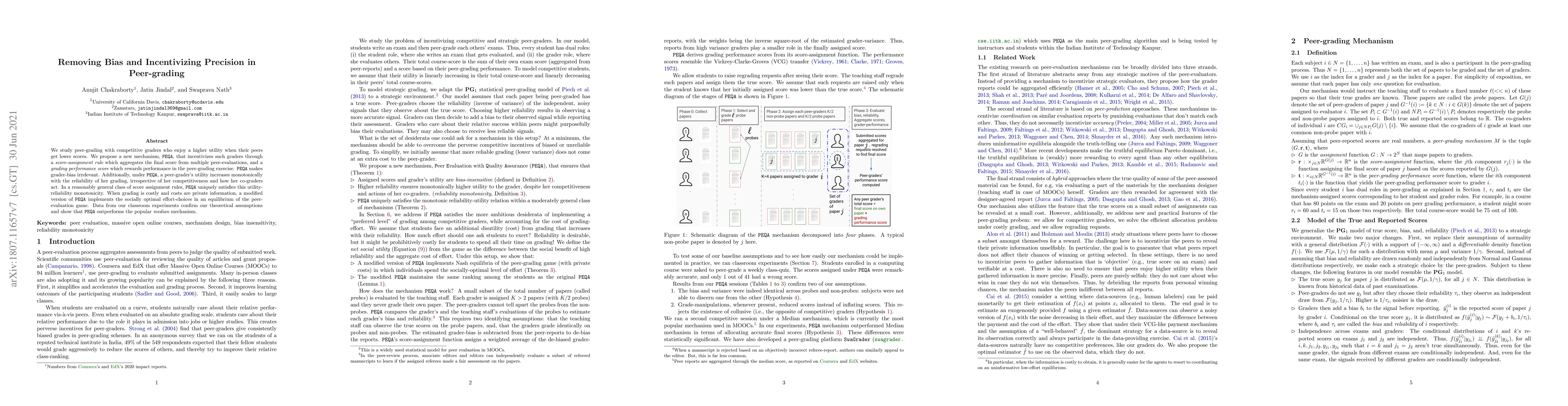 The paper proposes PEQA, a new mechanism to incentivize precision and reduce bias in peer-grading by rewarding reliable grading and making grader-bias irrelevant. PEQA outperforms the median mechanism in experiments, achieving socially optimal effort in grading when costs are private information.