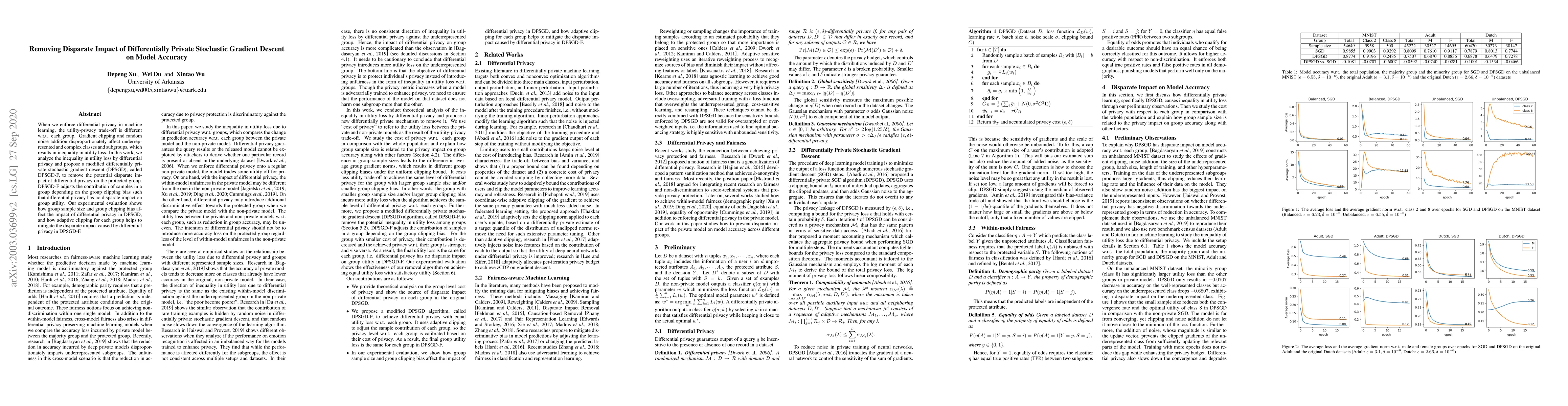 When we enforce differential privacy in machine learning, the utility-privacy trade-off is different w.r.t. each group. Gradient clipping and random noise addition disproportionately affect underrepresented and complex classes and subgroups, which results in inequality in utility loss. In this work, we analyze the inequality in utility loss by differential privacy and propose a modified differentially private stochastic gradient descent (DPSGD), called DPSGD-F, to remove the potential disparate impact of differential privacy on the protected group. DPSGD-F adjusts the contribution of samples in a group depending on the group clipping bias such that differential privacy has no disparate impact on group utility. Our experimental evaluation shows how group sample size and group clipping bias affect the impact of differential privacy in DPSGD, and how adaptive clipping for each group helps to mitigate the disparate impact caused by differential privacy in DPSGD-F.