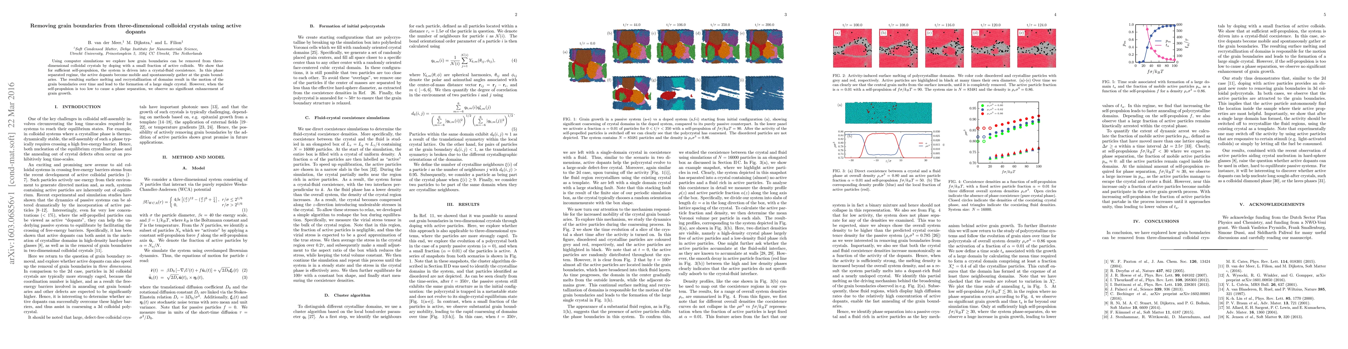 **Summary:** This research uses computer simulations to demonstrate that doping three-dimensional colloidal crystals with a small fraction of self-propelled active colloids can effectively remove grain boundaries through surface melting and recrystallization, leading to the formation of a large single crystal. However, insufficient self-propulsion does not enhance grain growth.