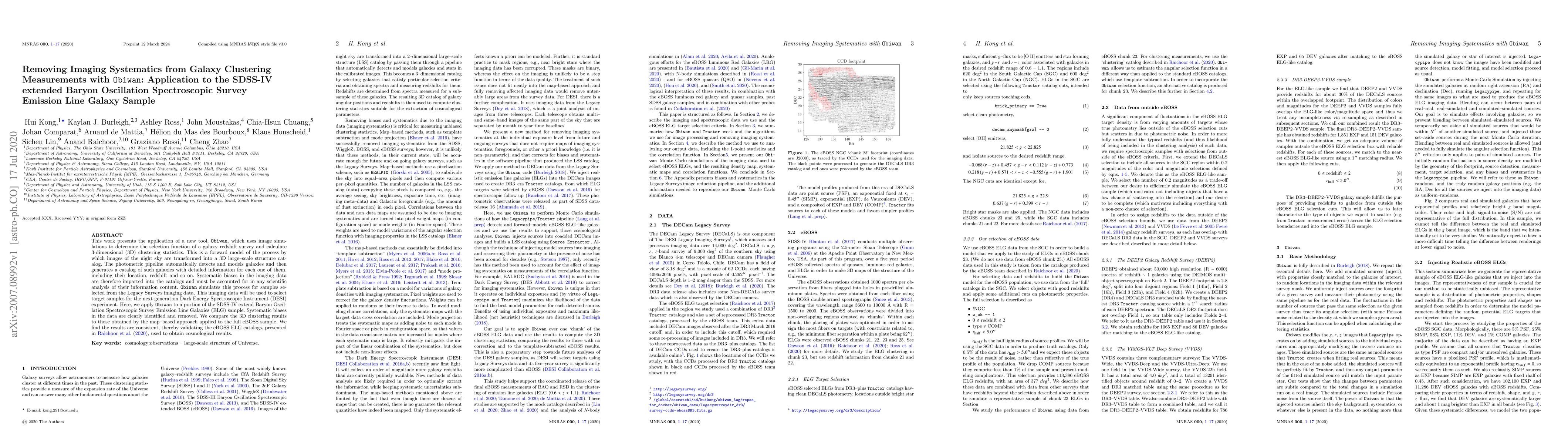 This work presents the application of a new tool, Obiwan , which uses image simulations to determine the selection function of a galaxy redshift survey and calculate 3-dimensional (3D) clustering statistics. This is a forward model of the process by which images of the night sky are transformed into a 3D large--scale structure catalog. The photometric pipeline automatically detects and models galaxies and then generates a catalog of such galaxies with detailed information for each one of them, including their location, redshift and so on. Systematic biases in the imaging data are therefore imparted into the catalogs and must be accounted for in any scientific analysis of their information content. Obiwan simulates this process for samples selected from the Legacy Surveys imaging data. This imaging data will be used to select target samples for the next-generation Dark Energy Spectroscopic Instrument (DESI) experiment. Here, we apply Obiwan to a portion of the SDSS-IV extend Baryon Oscillation Spectroscopic Survey Emission Line Galaxies (ELG) sample. Systematic biases in the data are clearly identified and removed. We compare the 3D clustering results to those obtained by the map--based approach applied to the full eBOSS sample. We find the results are consistent, thereby validating the eBOSS ELG catalogs, presented in Raichoor(2020), used to obtain cosmological results.
