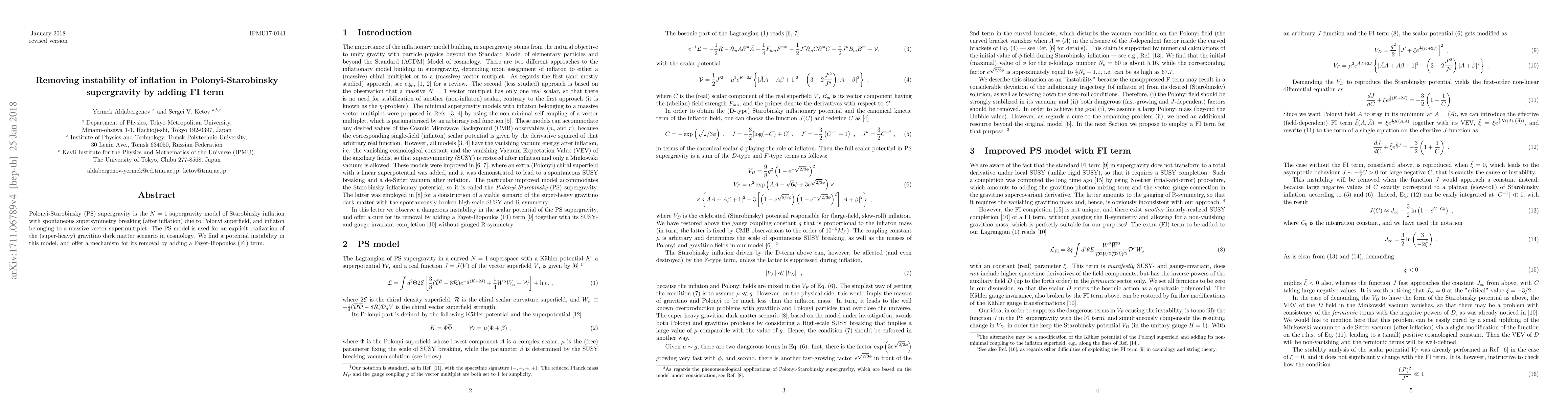 This paper addresses the instability in the Polonyi-Starobinsky supergravity model, which is used for gravitino dark matter scenarios. It proposes the addition of a Fayet-Iliopoulos term to resolve this instability, thereby stabilizing the model.