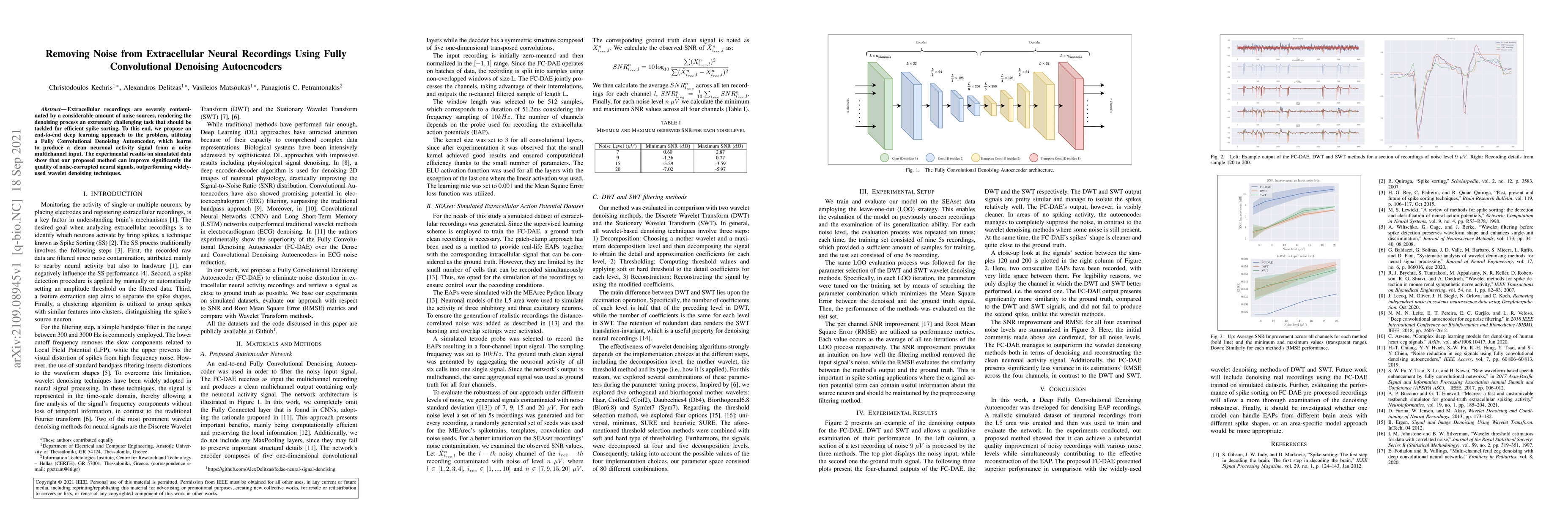 This paper proposes a Fully Convolutional Denoising Autoencoder for removing noise from extracellular neural recordings, significantly improving signal quality compared to traditional wavelet denoising techniques. The method demonstrates superior performance on simulated data, enhancing the efficiency of spike sorting.