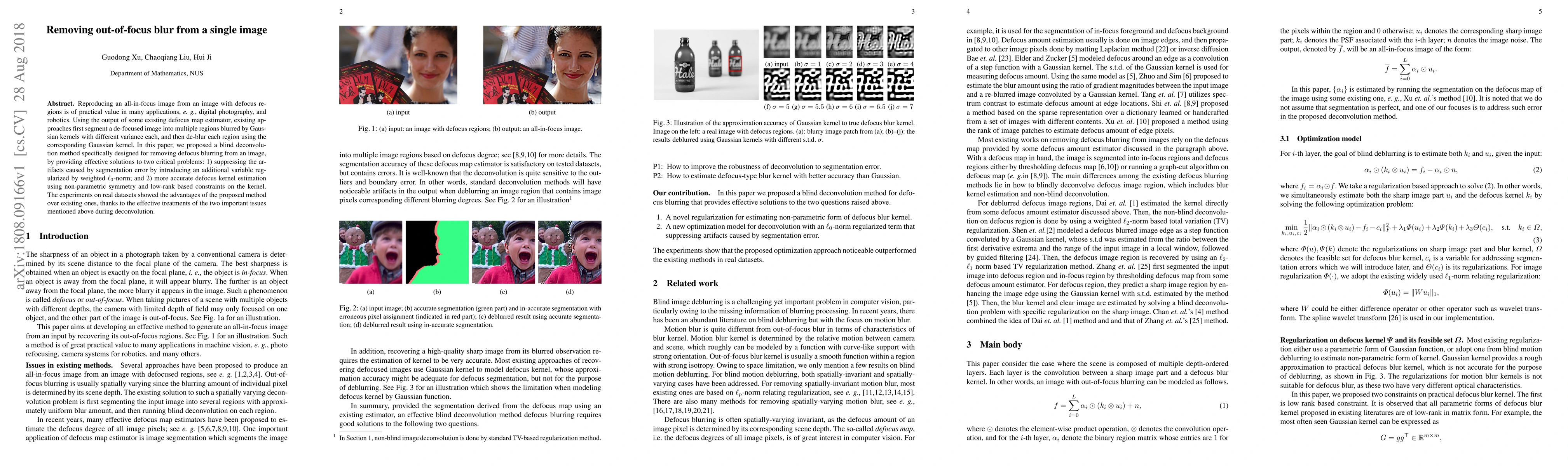 This paper proposes a blind deconvolution method to remove defocus blur from images, addressing two key issues: segmentation error artifacts and inaccurate kernel estimation, achieving better results than existing approaches.