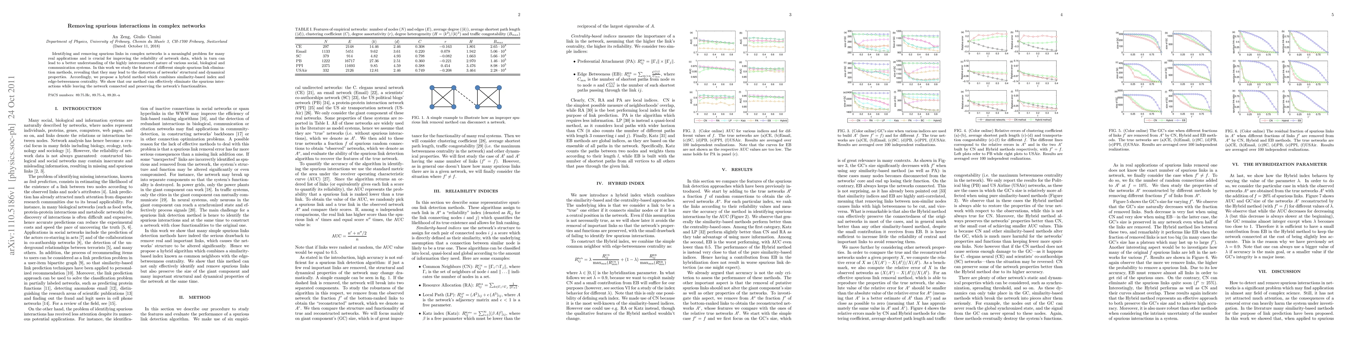 Researchers propose a hybrid method to remove spurious interactions in complex networks while preserving structural and dynamical properties. Their approach combines similarity-based index with edge-betweenness centrality, effectively eliminating spurious links without distorting network functionalities.