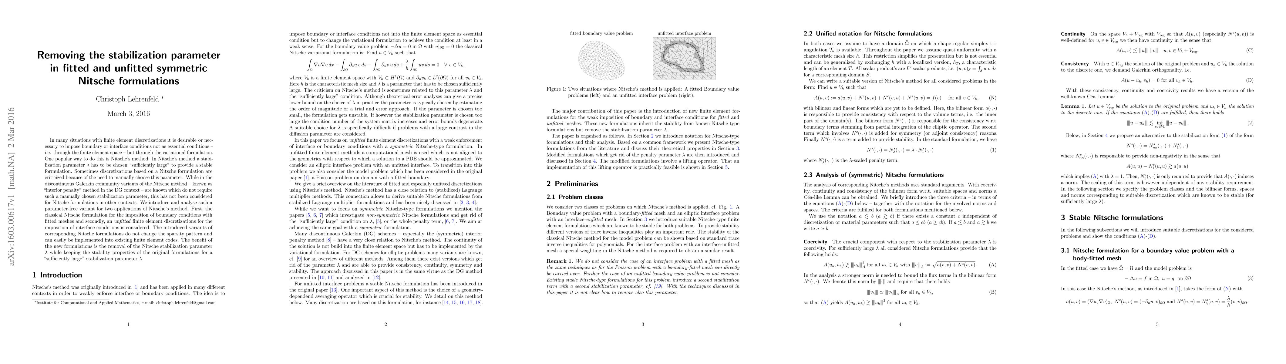 In many situations with finite element discretizations it is desirable or necessary to impose boundary or interface conditions not as essential conditions -- i.e. through the finite element space -- but through the variational formulation. One popular way to do this is Nitsche's method. In Nitsche's method a stabilization parameter $\lambda$ has to be chosen "sufficiently large" to provide a stable formulation. Sometimes discretizations based on a Nitsche formulation are criticized because of the need to manually choose this parameter. While in the discontinuous Galerkin community variants of the Nitsche method -- known as "interior penalty" method in the DG context -- are known which do not require such a manually chosen stabilization parameter, this has not been considered for Nitsche formulations in other contexts. We introduce and analyse such a parameter-free variant for two applications of Nitsche's method. First, the classical Nitsche formulation for the imposition of boundary conditions with fitted meshes and secondly, an unfitted finite element discretizations for the imposition of interface conditions is considered. The introduced variants of corresponding Nitsche formulations do not change the sparsity pattern and can easily be implemented into existing finite element codes. The benefit of the new formulations is the removal of the Nitsche stabilization parameter $\lambda$ while keeping the stability properties of the original formulations for a "sufficiently large" stabilization parameter $\lambda$.
