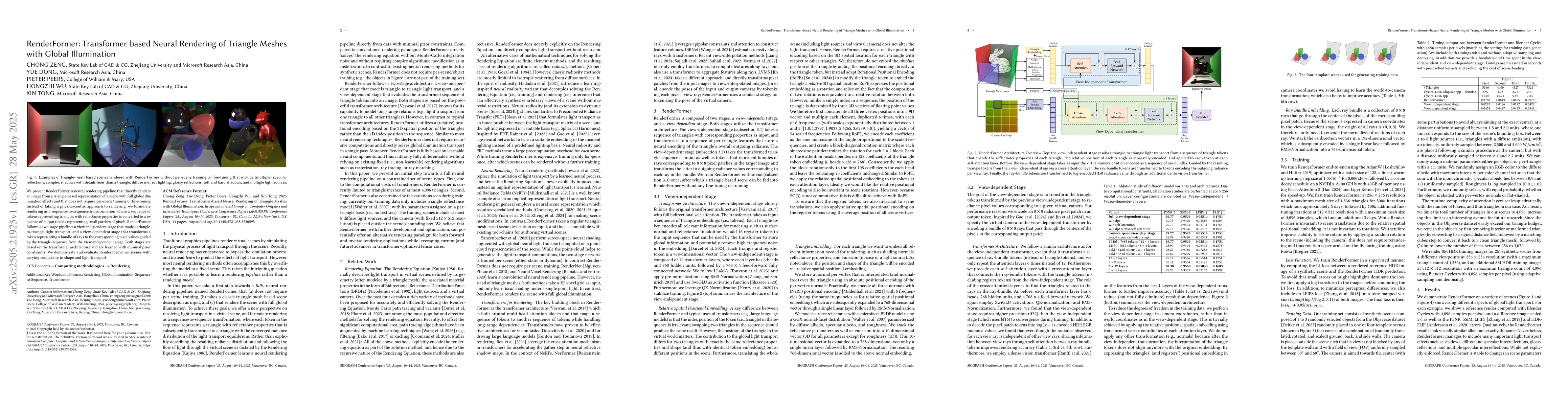 RenderFormer is a neural rendering pipeline that directly renders images from triangle-based scenes with global illumination without requiring per-scene training, using a sequence-to-sequence transformer approach.