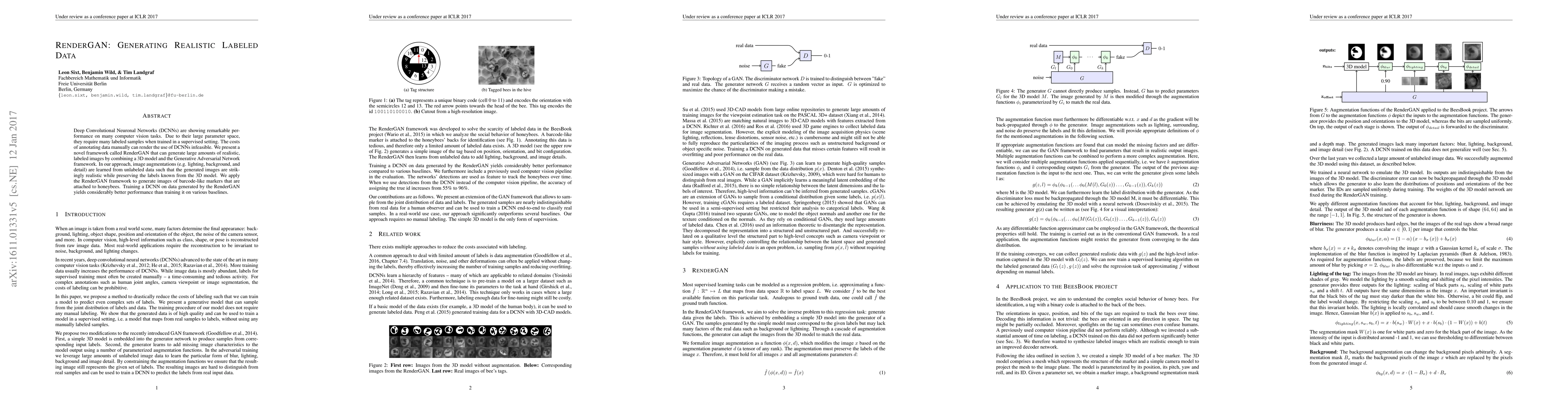 RenderGAN combines a 3D model with Generative Adversarial Networks to generate realistic, labeled images, addressing the high cost of manual data annotation for deep convolutional networks. This method significantly improves training performance for DCNNs on tasks like identifying barcode-like markers on honeybees.