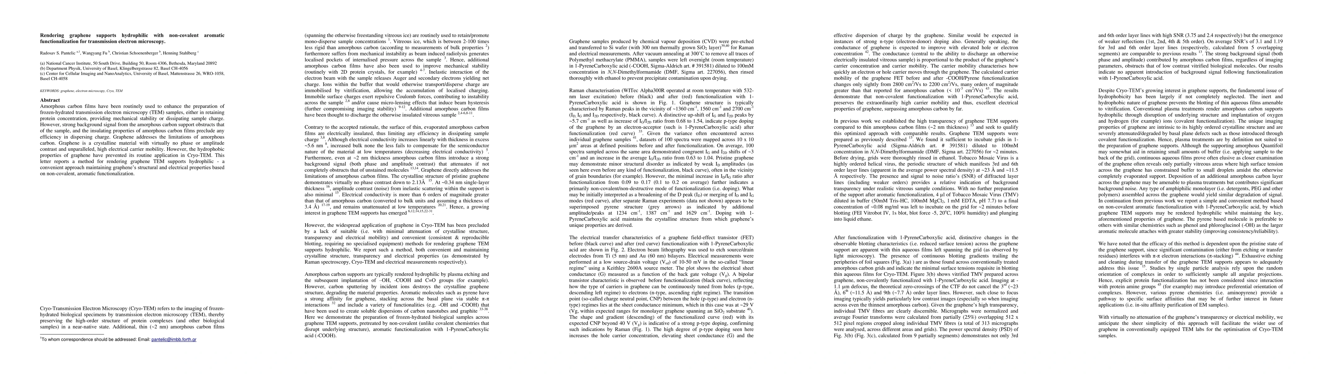 This paper presents a method to make graphene hydrophilic using non-covalent aromatic functionalization, addressing its hydrophobic nature and enabling its use in cryo-transmission electron microscopy (TEM) while preserving its structural and electrical properties. This approach aims to enhance the preparation of frozen-hydrated TEM samples by overcoming the limitations of amorphous carbon supports.