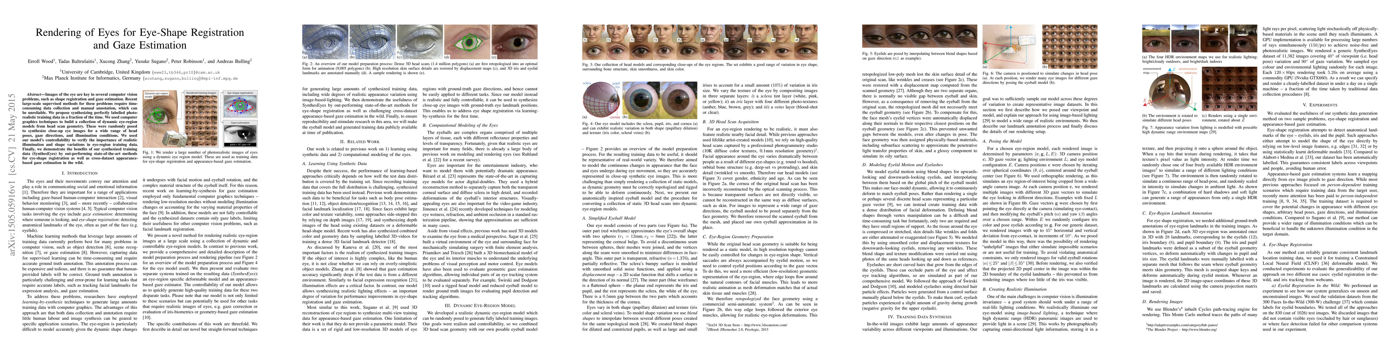 This paper proposes a method to synthesize photo-realistic eye images for training in eye-shape registration and gaze estimation, significantly reducing the need for manual data collection and annotation. The authors use computer graphics to create dynamic eye-region models, demonstrating improved performance over state-of-the-art methods using their synthesized dataset, SynthesEyes.
