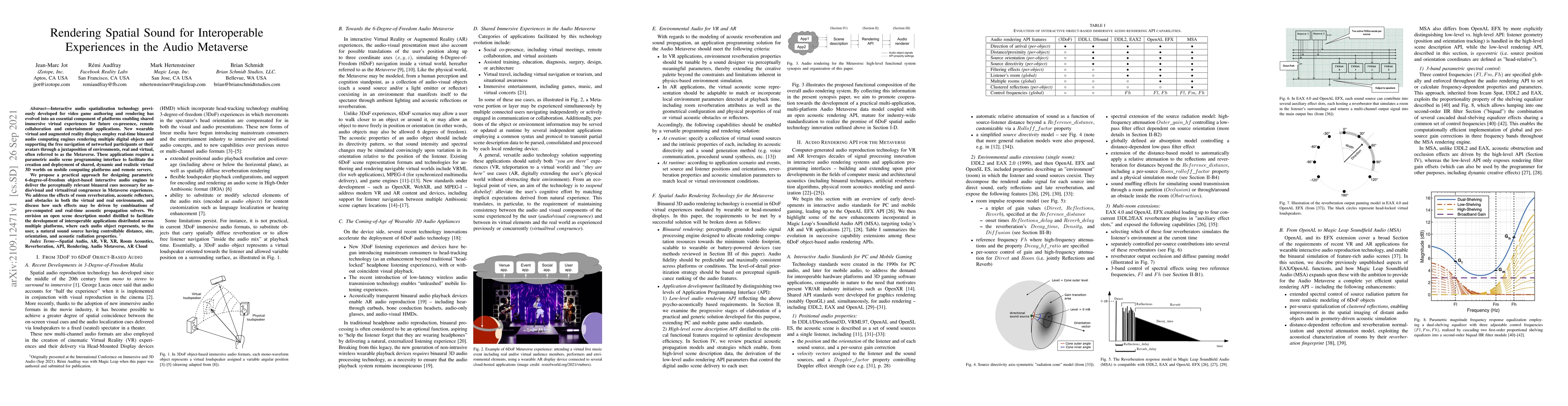 Interactive audio spatialization technology previously developed for video game authoring and rendering has evolved into an essential component of platforms enabling shared immersive virtual experiences for future co-presence, remote collaboration and entertainment applications. New wearable virtual and augmented reality displays employ real-time binaural audio computing engines rendering multiple digital objects and supporting the free navigation of networked participants or their avatars through a juxtaposition of environments, real and virtual, often referred to as the Metaverse. These applications require a parametric audio scene programming interface to facilitate the creation and deployment of shared, dynamic and realistic virtual 3D worlds on mobile computing platforms and remote servers. We propose a practical approach for designing parametric 6-degree-of-freedom object-based interactive audio engines to deliver the perceptually relevant binaural cues necessary for audio/visual and virtual/real congruence in Metaverse experiences. We address the effects of room reverberation, acoustic reflectors, and obstacles in both the virtual and real environments, and discuss how such effects may be driven by combinations of pre-computed and real-time acoustic propagation solvers. We envision an open scene description model distilled to facilitate the development of interoperable applications distributed across multiple platforms, where each audio object represents, to the user, a natural sound source having controllable distance, size, orientation, and acoustic radiation properties.