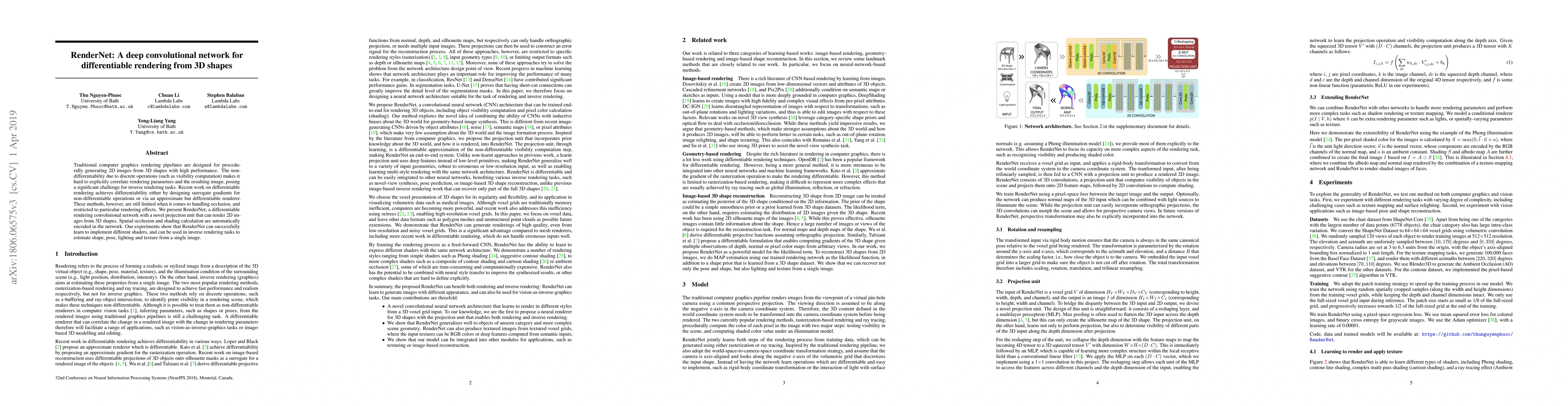 RenderNet is a deep convolutional network designed for differentiable rendering from 3D shapes, addressing occlusion and shading through a novel projection unit. It enables inverse rendering tasks to estimate shape, pose, lighting, and texture from a single image.