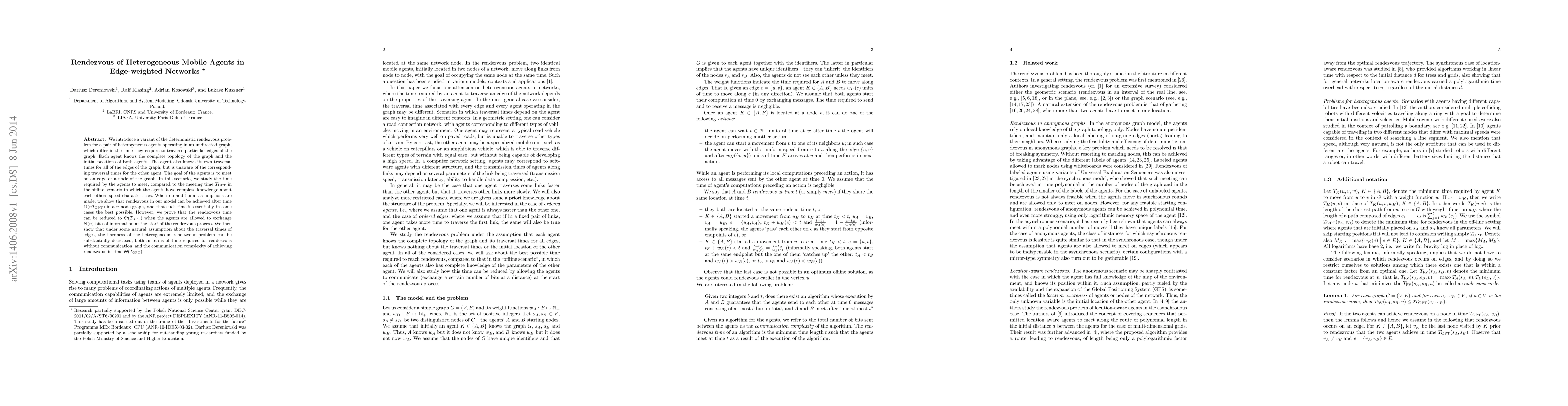 The paper introduces a variant of the deterministic rendezvous problem for heterogeneous mobile agents in edge-weighted networks, analyzing the time required for meeting compared to the optimal offline scenario.