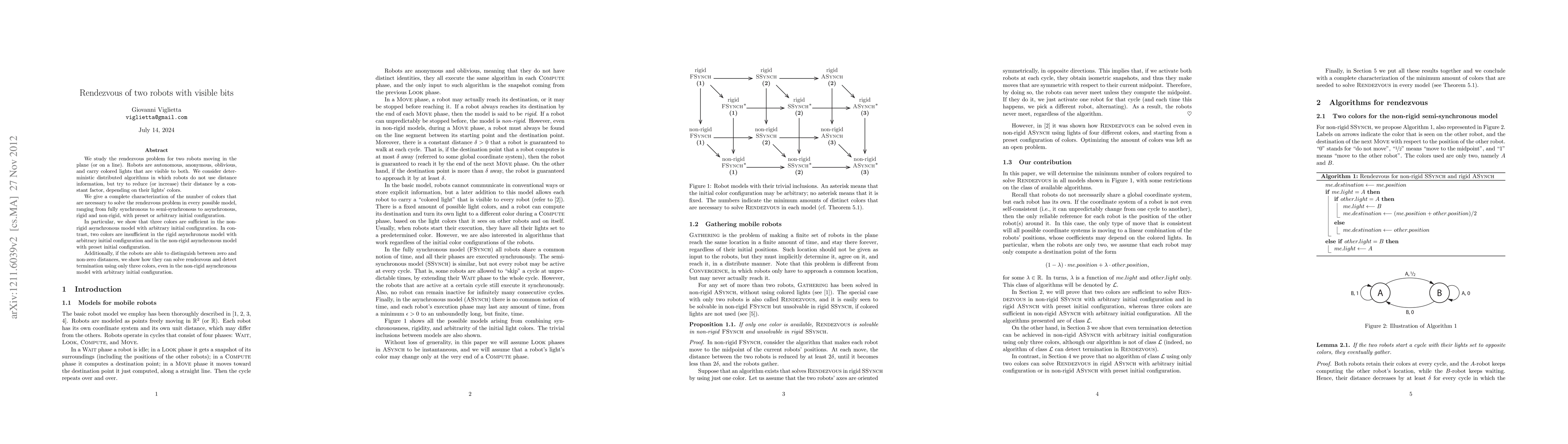 This paper explores the rendezvous problem for two autonomous robots in a plane or on a line, focusing on deterministic distributed algorithms where robots use visible colored lights to determine their distance. It provides a comprehensive analysis of the minimum number of colors required for successful rendezvous under various models, concluding that three colors suffice in the non-rigid asynchronous model, while two are insufficient in rigid asynchronous models.