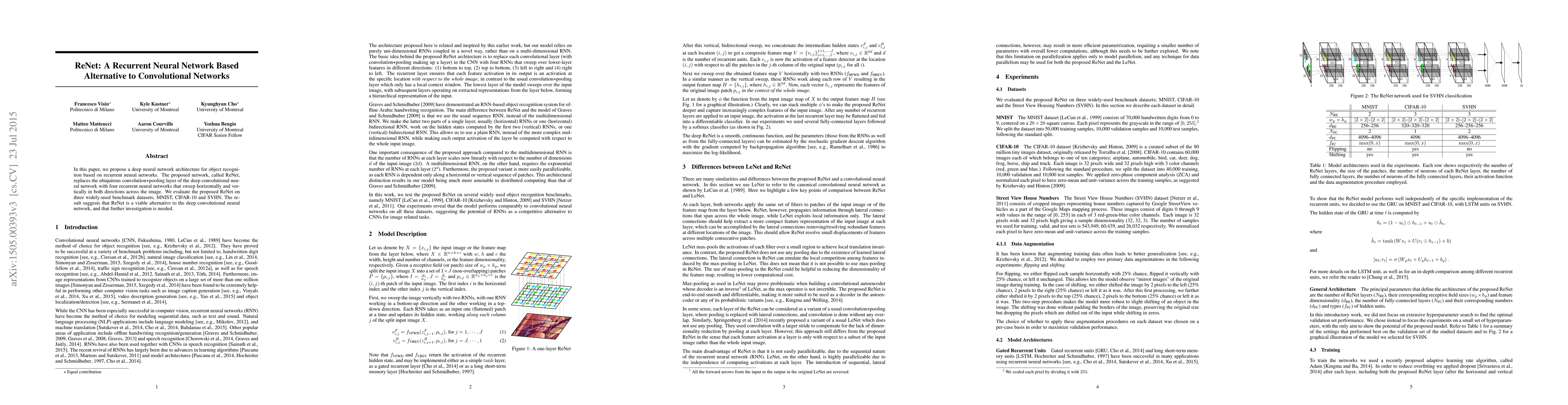 Summary: This paper introduces ReNet, a recurrent neural network architecture for object recognition that replaces convolutional layers with recurrent networks. Initial evaluations on MNIST, CIFAR-10, and SVHN datasets indicate ReNet's potential as a viable alternative to traditional convolutional networks.
