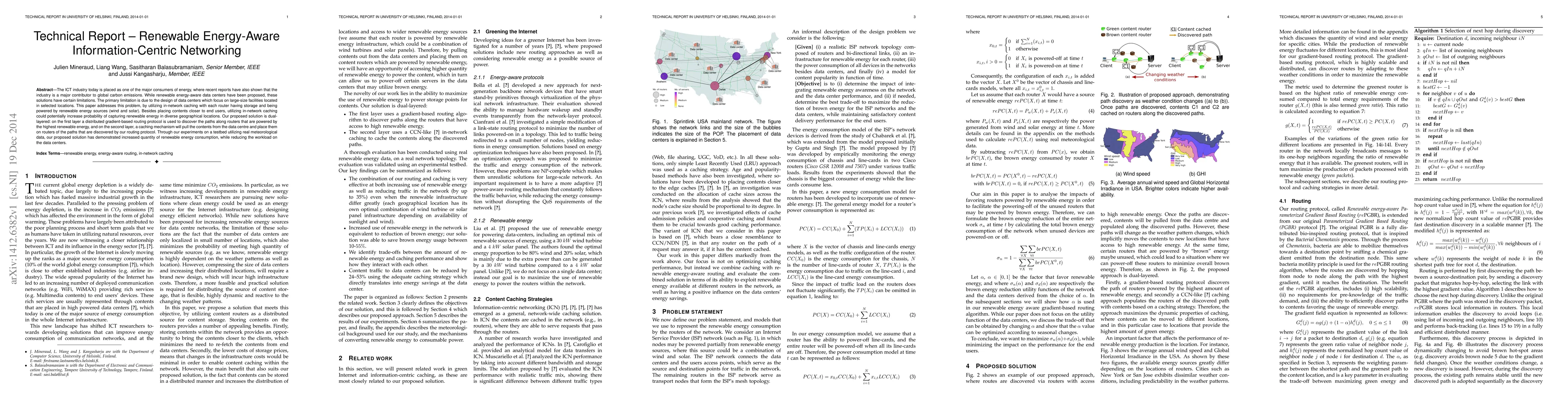 The ICT industry today is placed as one of the major consumers of energy, where recent reports have also shown that the industry is a major contributor to global carbon emissions. While renewable energy-aware data centers have been proposed, these solutions have certain limitations. The primary limitation is due to the design of data centers which focus on large-size facilities located in selected locations. This paper addresses this problem, by utilizing in-network caching with each router having storage and being powered by renewable energy sources (wind and solar). Besides placing contents closer to end users, utilizing in-network caching could potentially increase probability of capturing renewable energy in diverse geographical locations. Our proposed solution is dual- layered: on the first layer a distributed gradient-based routing protocol is used to discover the paths along routers that are powered by the highest renewable energy, and on the second layer, a caching mechanism will pull the contents from the data centre and place them on routers of the paths that are discovered by our routing protocol. Through our experiments on a testbed utilizing real meteorological data, our proposed solution has demonstrated increased quantity of renewable energy consumption, while reducing the workload on the data centers.