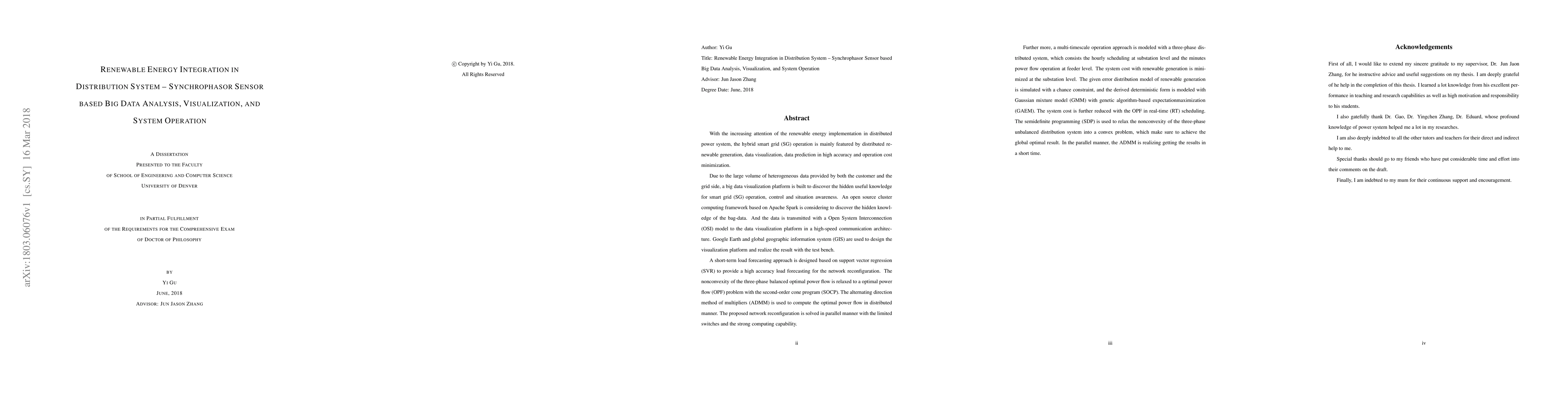 Due to the large volume of heterogeneous data provided by both the customer and the grid side, a big data visualization platform is built to discover the hidden useful knowledge for smart grid (SG) operation, control and situation awareness. An open source cluster computing framework based on Apache Spark is considering to discover the hidden knowledge of the bag-data. And the data is transmitted with a Open System Interconnection (OSI) model to the data visualization platform in a high-speed communication architecture. Google Earth and global geographic information system (GIS) are used to design the visualization platform and realize the result with the test bench. The alternating direction method of multipliers (ADMM) is used to compute the optimal power flow in distributed manner. The proposed network reconfiguration is solved in parallel manner with the limited switches and the strong computing capability. Further more, a multi-timescale operation approach is modeled with a three-phase distributed system, which consists the hourly scheduling at substation level and the minutes power flow operation at feeder level. The system cost with renewable generation is minimized at the substation level. The given error distribution model of renewable generation is simulated with a chance constraint, and the derived deterministic form is modeled with Gaussian mixture model (GMM) with genetic algorithm-based expectationmaximization (GAEM). The system cost is further reduced with the OPF in real-time (RT) scheduling. The semidefinite programming (SDP) is used to relax the nonconvexity of the three-phase unbalanced distribution system into a convex problem, which make sure to achieve the global optimal result. In the parallel manner, the ADMM is realizing getting the results in a short time.