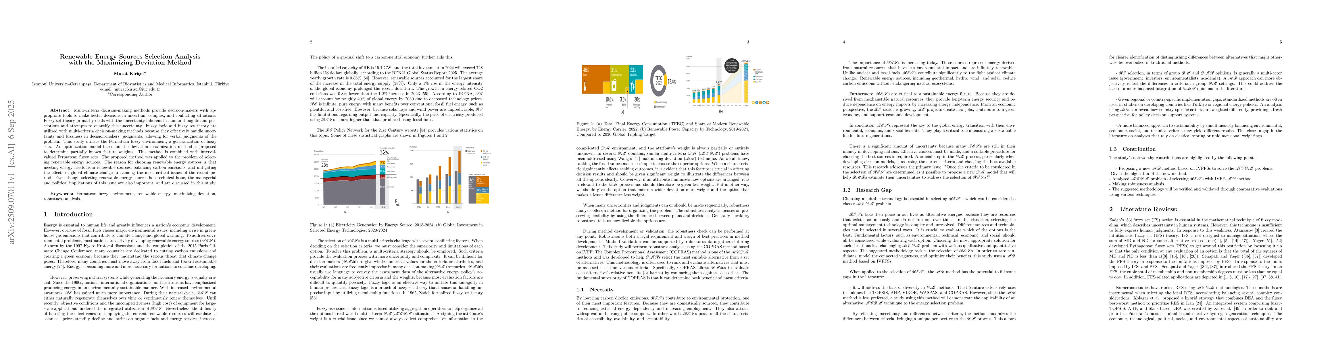 Multi-criteria decision-making methods provide decision-makers with appropriate tools to make better decisions in uncertain, complex, and conflicting situations. Fuzzy set theory primarily deals with the uncertainty inherent in human thoughts and perceptions and attempts to quantify this uncertainty. Fuzzy logic and fuzzy set theory are utilized with multi-criteria decision-making methods because they effectively handle uncertainty and fuzziness in decision-makers' judgments, allowing for verbal judgments of the problem. This study utilizes the Fermatean fuzzy environment, a generalization of fuzzy sets. An optimization model based on the deviation maximization method is proposed to determine partially known feature weights. This method is combined with interval-valued Fermatean fuzzy sets. The proposed method was applied to the problem of selecting renewable energy sources. The reason for choosing renewable energy sources is that meeting energy needs from renewable sources, balancing carbon emissions, and mitigating the effects of global climate change are among the most critical issues of the recent period. Even though selecting renewable energy sources is a technical issue, the managerial and political implications of this issue are also important, and are discussed in this study.