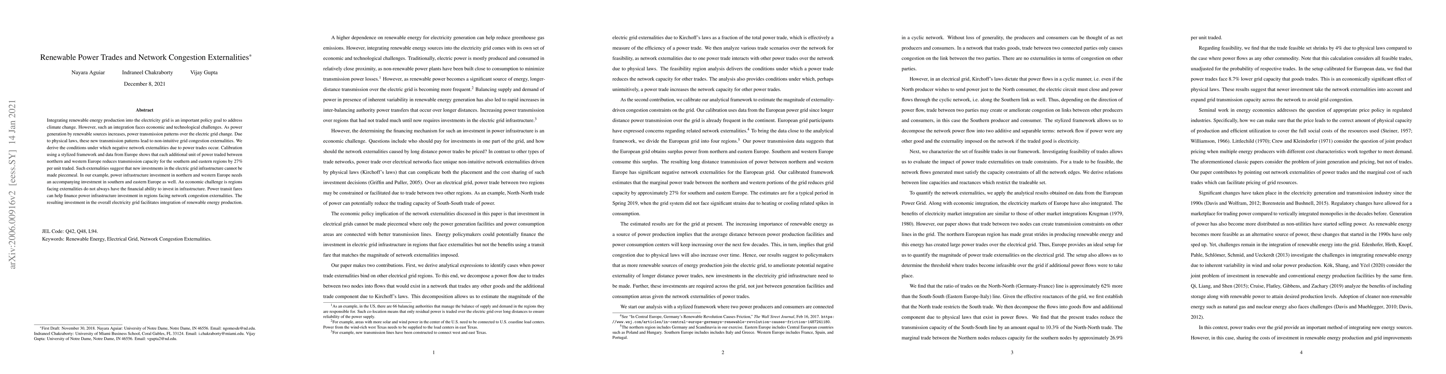 This paper examines the economic and technological challenges of integrating renewable energy into the electricity grid, highlighting how increased renewable power generation leads to grid congestion externalities. The study finds that each additional unit of power traded between northern and western Europe reduces southern and eastern regions' transmission capacity by 27%, necessitating coordinated infrastructure investments across regions.