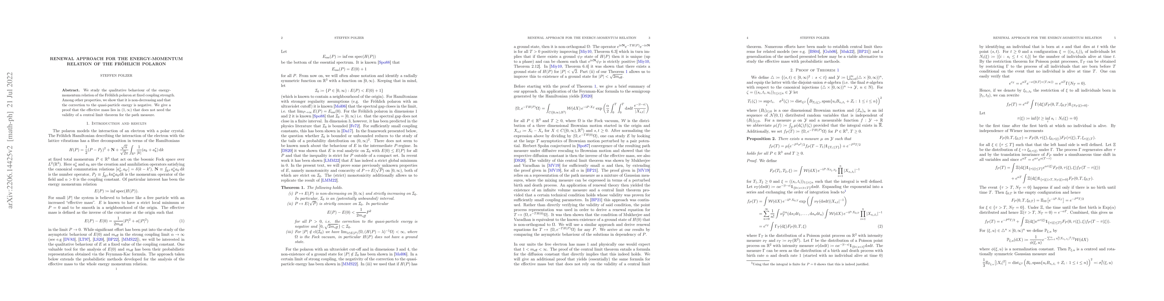 This research investigates the energy-momentum relation for the Fröhlich polaron, revealing it is non-decreasing and that its quasi-particle energy correction is negative. The study provides a proof that the effective mass lies between 1 and infinity, independent of a central limit theorem for the path measure.