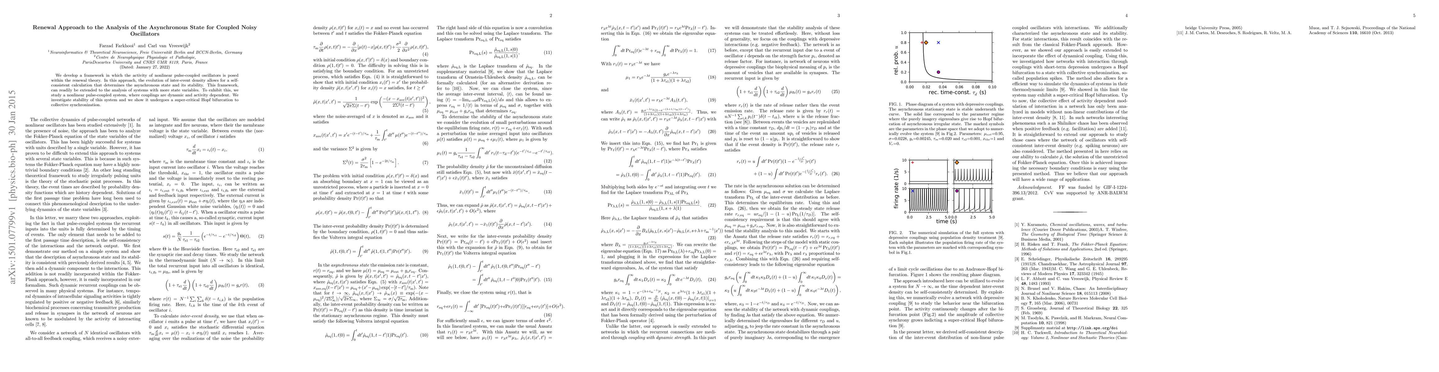 Researchers develop a framework using renewal theory to analyze asynchronous states in coupled noisy oscillators, finding that they undergo super-critical Hopf bifurcations to collective synchronization.