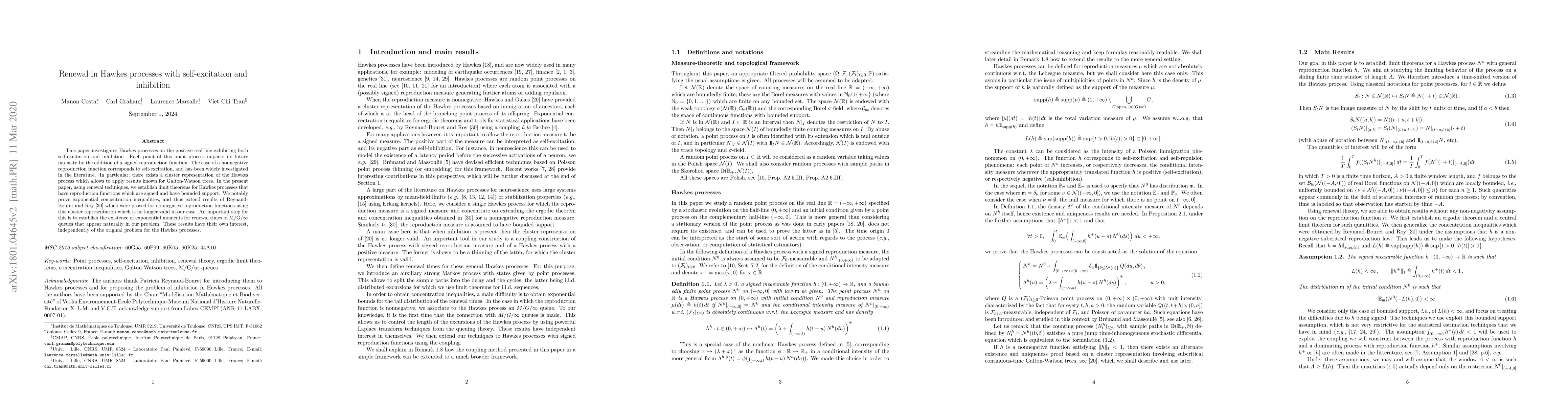 This paper explores Hawkes processes with both self-excitation and inhibition, establishing limit theorems and exponential concentration inequalities using renewal techniques. It extends previous results for nonnegative reproduction functions by proving the existence of exponential moments for renewal times in M/G/infinity queues.