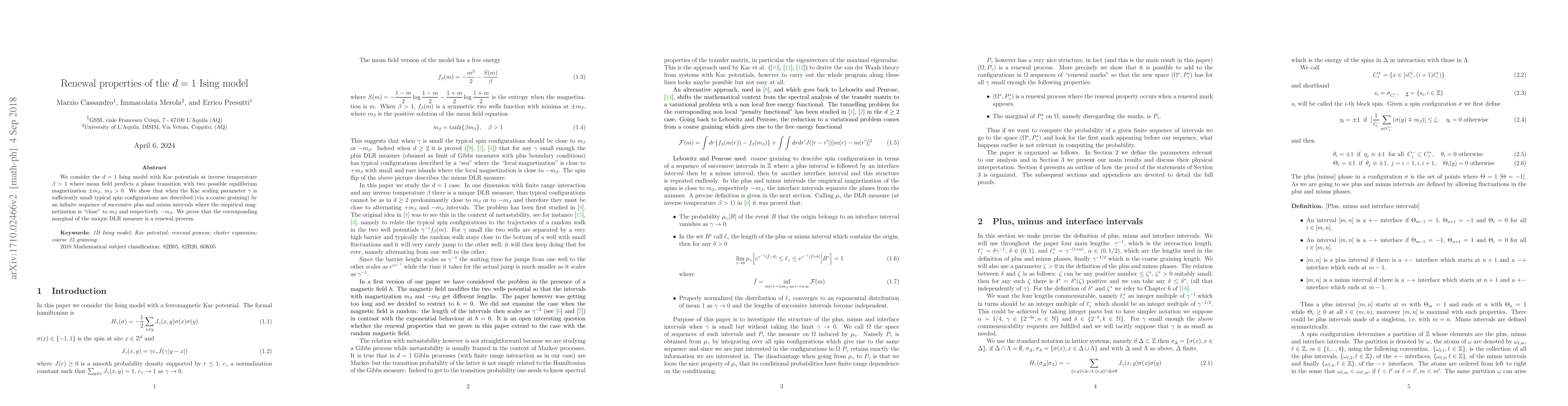 We consider the $d=1$ Ising model with Kac potentials at inverse temperature $\beta>1$ where mean field predicts a phase transition with two possible equilibrium magnetization $\pm m_\beta$, $m_\beta>0$. We show that when the Kac scaling parameter $\gamma$ is sufficiently small typical spin configurations are described (via a coarse graining) by an infinite sequence of successive plus and minus intervals where the empirical magnetization is "close" to $m_\beta$ and respectively $-m_\beta$. We prove that the corresponding marginal of the unique DLR measure is a renewal process.