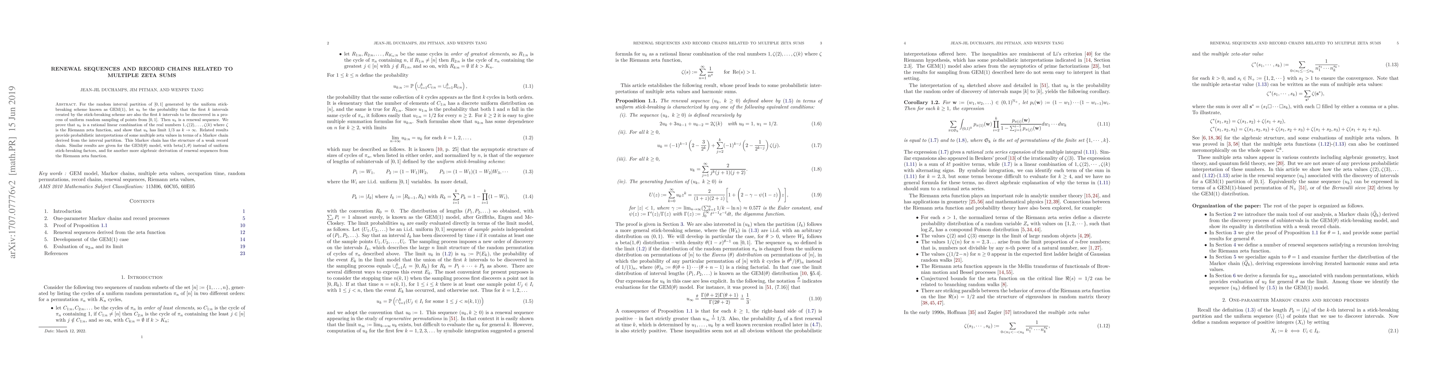For the random interval partition of $[0,1]$ generated by the uniform stick-breaking scheme known as GEM$(1)$, let $u_k$ be the probability that the first $k$ intervals created by the stick-breaking scheme are also the first $k$ intervals to be discovered in a process of uniform random sampling of points from $[0,1]$. Then $u_k$ is a renewal sequence. We prove that $u_k$ is a rational linear combination of the real numbers $1, \zeta(2), \ldots, \zeta(k)$ where $\zeta$ is the Riemann zeta function, and show that $u_k$ has limit $1/3$ as $k \to \infty$. Related results provide probabilistic interpretations of some multiple zeta values in terms of a Markov chain derived from the interval partition. This Markov chain has the structure of a weak record chain. Similar results are given for the GEM$(\theta)$ model, with beta$(1,\theta)$ instead of uniform stick-breaking factors, and for another more algebraic derivation of renewal sequences from the Riemann zeta function.