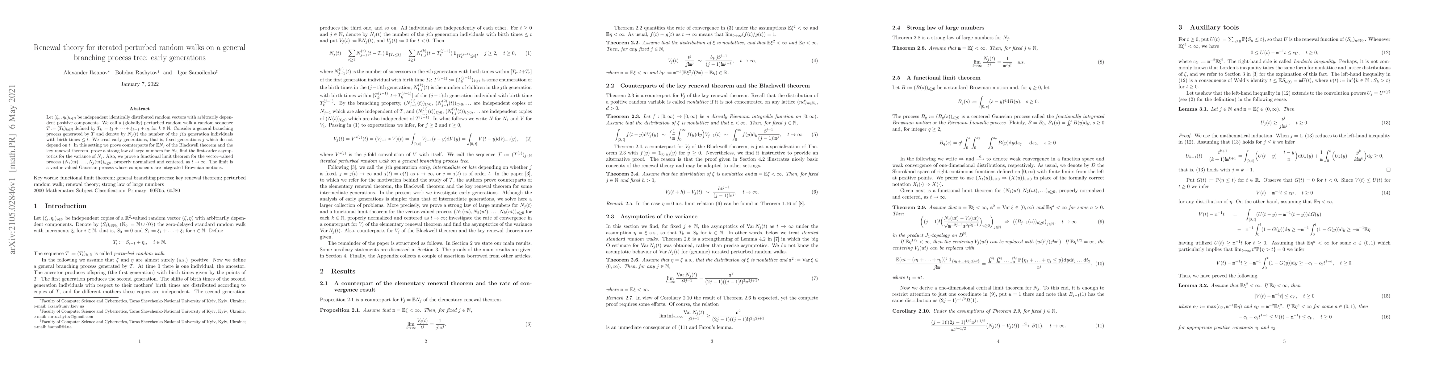 This paper explores perturbed random walks on a branching process tree, focusing on early generations. It establishes renewal theory results, including a strong law of large numbers, variance asymptotics, and a functional limit theorem for the number of individuals in fixed generations, showing convergence to a vector-valued Gaussian process.