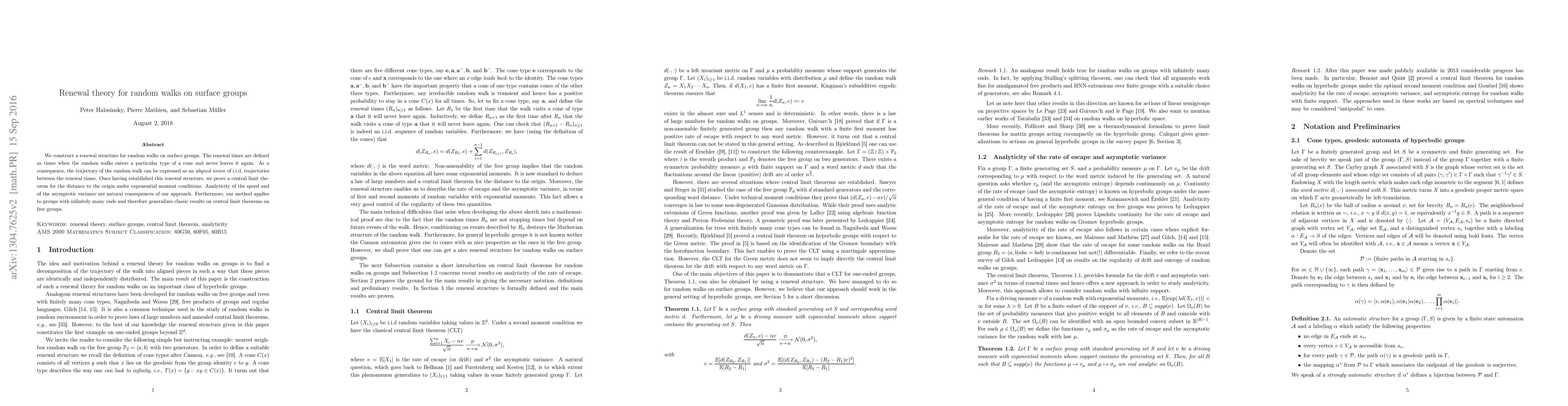 This paper constructs a renewal structure for random walks on surface groups, defining renewal times as entries into specific cones. The authors prove a central limit theorem for the distance to the origin under exponential moment conditions, demonstrating analyticity of the speed and variance, and extending classic results to groups with infinitely many ends.
