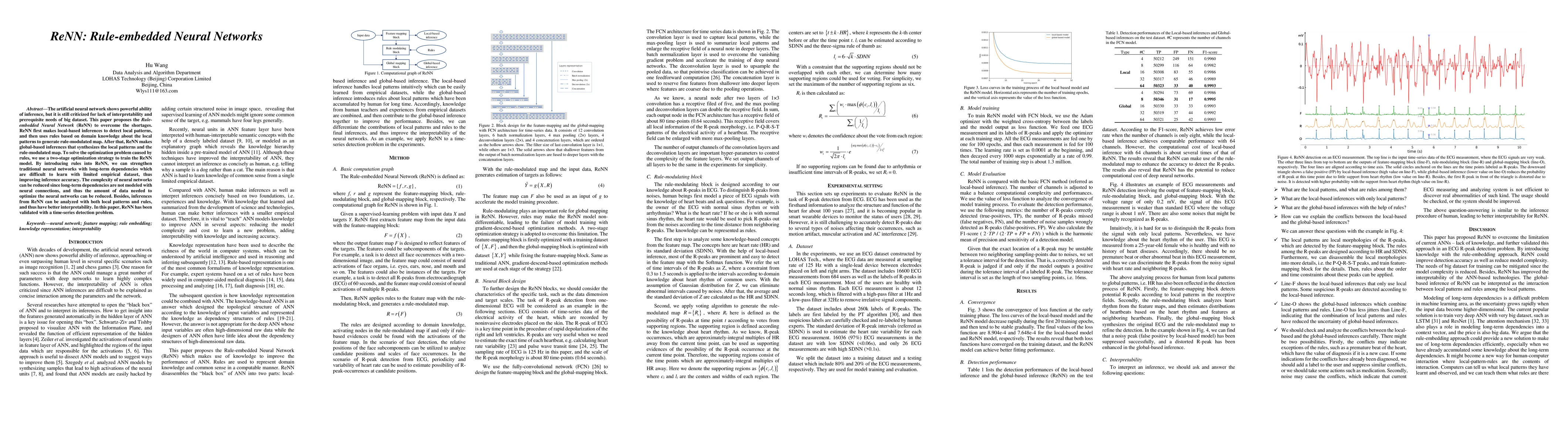 The artificial neural network shows powerful ability of inference, but it is still criticized for lack of interpretability and prerequisite needs of big dataset. This paper proposes the Rule-embedded Neural Network (ReNN) to overcome the shortages. ReNN first makes local-based inferences to detect local patterns, and then uses rules based on domain knowledge about the local patterns to generate rule-modulated map. After that, ReNN makes global-based inferences that synthesizes the local patterns and the rule-modulated map. To solve the optimization problem caused by rules, we use a two-stage optimization strategy to train the ReNN model. By introducing rules into ReNN, we can strengthen traditional neural networks with long-term dependencies which are difficult to learn with limited empirical dataset, thus improving inference accuracy. The complexity of neural networks can be reduced since long-term dependencies are not modeled with neural connections, and thus the amount of data needed to optimize the neural networks can be reduced. Besides, inferences from ReNN can be analyzed with both local patterns and rules, and thus have better interpretability. In this paper, ReNN has been validated with a time-series detection problem.