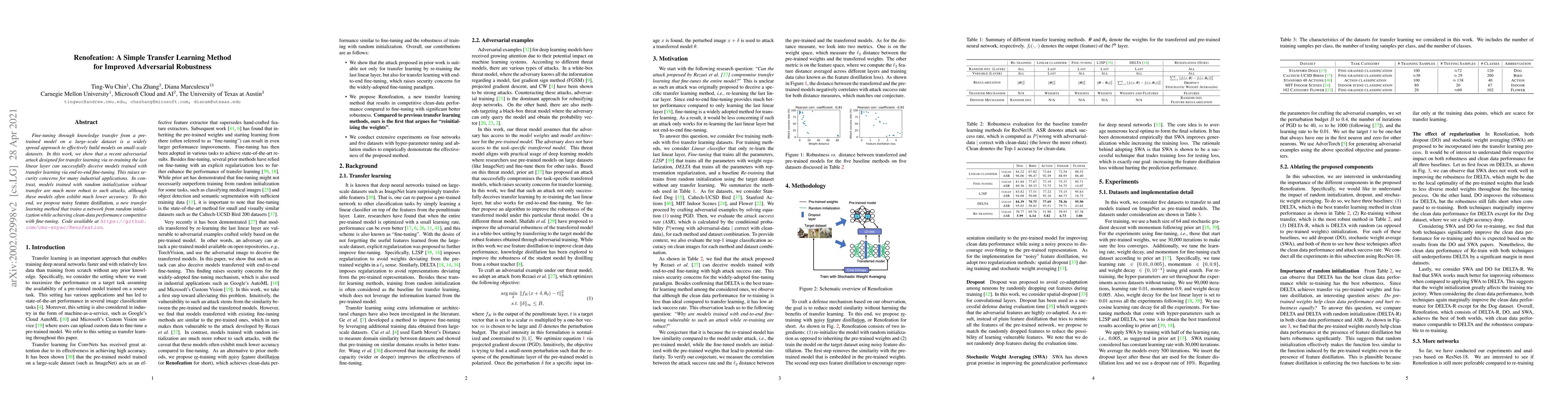 Fine-tuning through knowledge transfer from a pre-trained model on a large-scale dataset is a widely spread approach to effectively build models on small-scale datasets. In this work, we show that a recent adversarial attack designed for transfer learning via re-training the last linear layer can successfully deceive models trained with transfer learning via end-to-end fine-tuning. This raises security concerns for many industrial applications. In contrast, models trained with random initialization without transfer are much more robust to such attacks, although these models often exhibit much lower accuracy. To this end, we propose noisy feature distillation, a new transfer learning method that trains a network from random initialization while achieving clean-data performance competitive with fine-tuning. Code available at https://github.com/cmu-enyac/Renofeation.