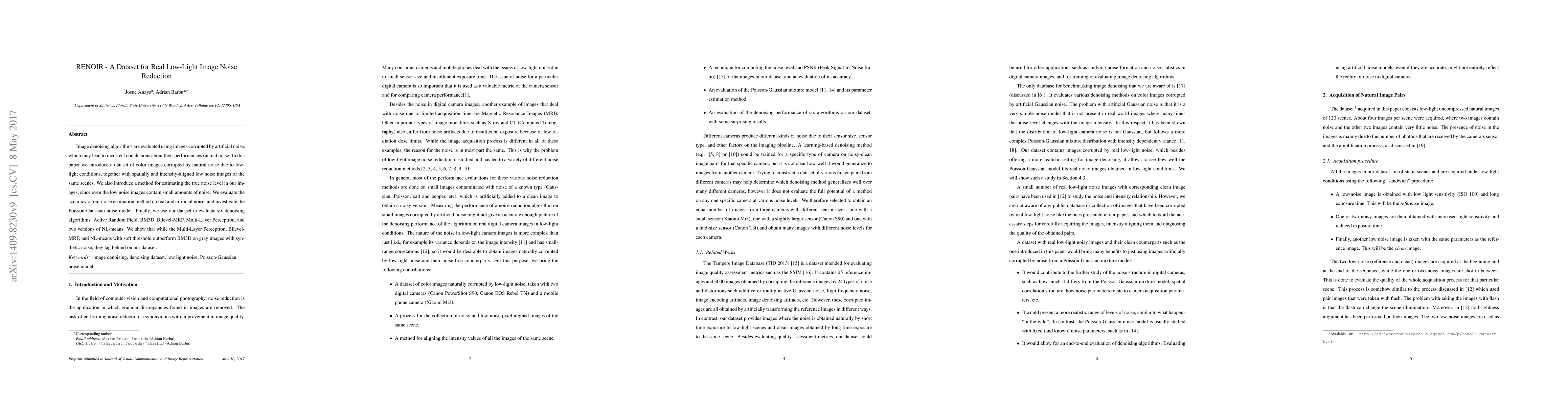 The paper introduces RENOIR, a dataset of color images corrupted by natural noise due to low-light conditions, along with spatially and intensity-aligned low noise images of the same scenes. It also presents a method for estimating true noise levels in images, considering that even low noise images contain small amounts of noise.