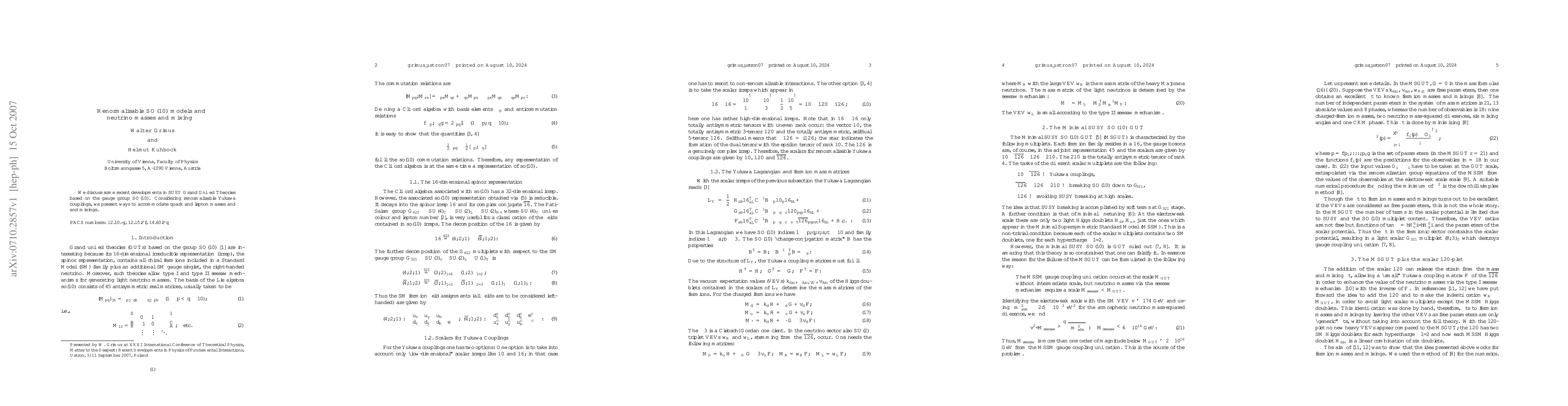 Summary: This paper explores SUSY Grand Unified Theories within the SO(10) framework, focusing on renormalisable Yukawa couplings to explain quark and lepton masses and mixings, particularly neutrino properties.