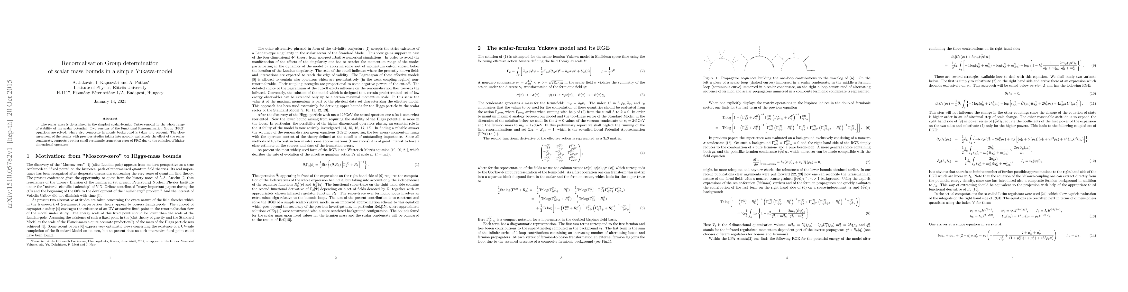 This paper uses the Functional Renormalisation Group (FRG) to determine scalar mass bounds in a simple Yukawa-model, considering both scalar and composite fermionic backgrounds. The results show close agreement with previous studies, indicating a small systematic error from omitting higher-dimensional operators.
