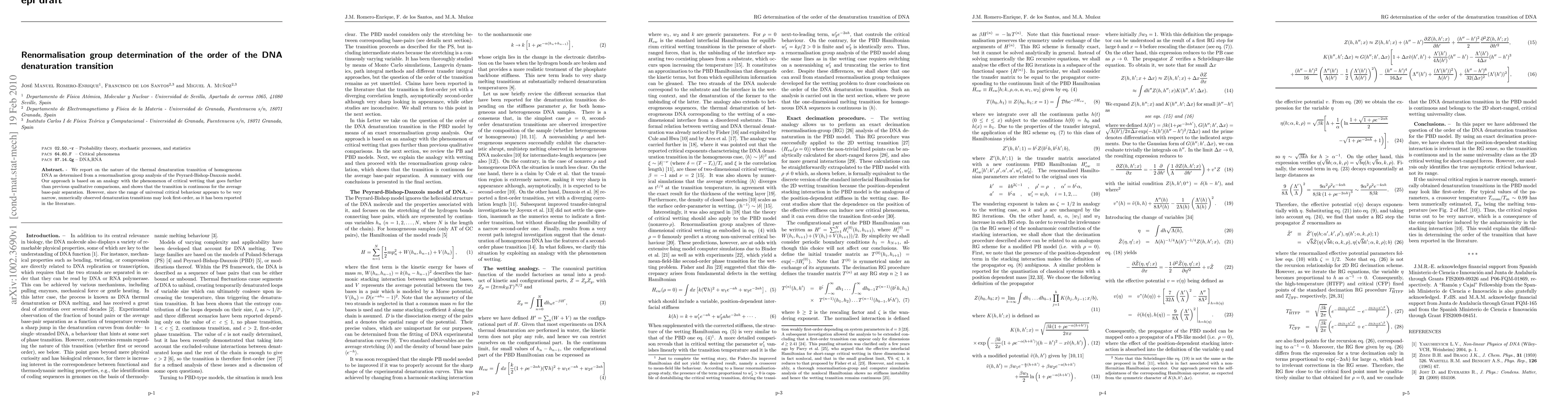 We report on the nature of the thermal denaturation transition of homogeneous DNA as determined from a renormalisation group analysis of the Peyrard-Bishop-Dauxois model. Our approach is based on an analogy with the phenomenon of critical wetting that goes further than previous qualitative comparisons, and shows that the transition is continuous for the average base-pair separation. However, since the range of universal critical behaviour appears to be very narrow, numerically observed denaturation transitions may look first-order, as it has been reported in the literature.