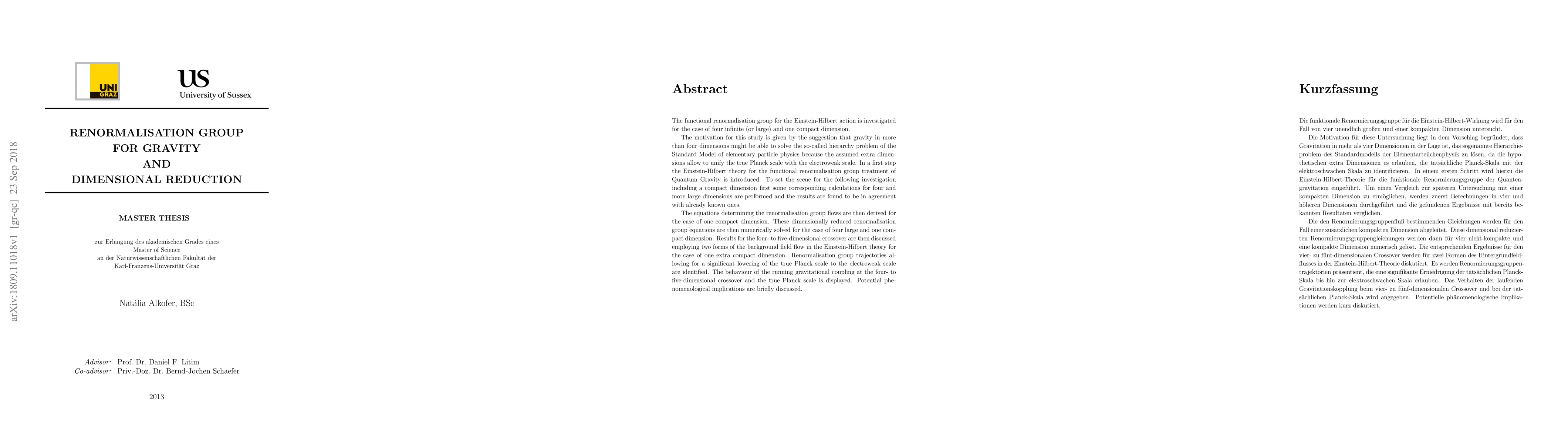 The functional renormalisation group for the Einstein-Hilbert action is investigated for the case of four infinite (or large) and one compact dimension. The motivation for this study is given by the suggestion that gravity in more than four dimensions might be able to solve the so-called hierarchy problem of the Standard Model of elementary particle physics because the assumed extra dimensions allow to unify the true Planck scale with the electroweak scale. In a first step the Einstein-Hilbert theory for the functional renormalisation group treatment of Quantum Gravity is introduced. To set the scene for the following investigation including a compact dimension first some corresponding calculations for four and more large dimensions are performed and the results are found to be in agreement with already known ones. The equations determining the renormalisation group flows are then derived for the case of one compact dimension. These dimensionally reduced renormalisation group equations are then numerically solved for the case of four large and one compact dimension. Results for the four- to five-dimensional crossover are then discussed employing two forms of the background field flow in the Einstein-Hilbert theory for the case of one extra compact dimension. Renormalisation group trajectories allowing for a significant lowering of the true Planck scale to the electroweak scale are identified. The behaviour of the running gravitational coupling at the four- to five-dimensional crossover and the true Planck scale is displayed. Potential phenomenological implications are briefly discussed.