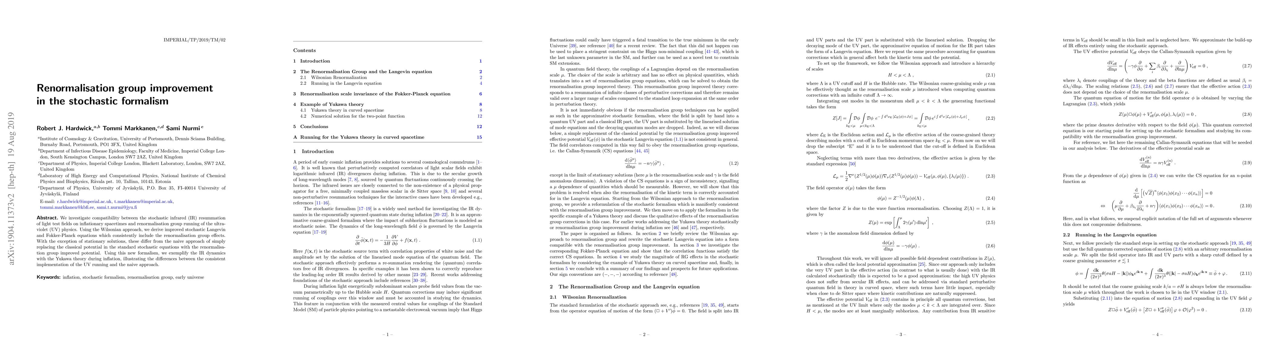 We investigate compatibility between the stochastic infrared (IR) resummation of light test fields on inflationary spacetimes and renormalisation group running of the ultra-violet (UV) physics. Using the Wilsonian approach, we derive improved stochastic Langevin and Fokker-Planck equations which consistently include the renormalisation group effects. With the exception of stationary solutions, these differ from the naive approach of simply replacing the classical potential in the standard stochastic equations with the renormalisation group improved potential. Using this new formalism, we exemplify the IR dynamics with the Yukawa theory during inflation, illustrating the differences between the consistent implementation of the UV running and the naive approach.