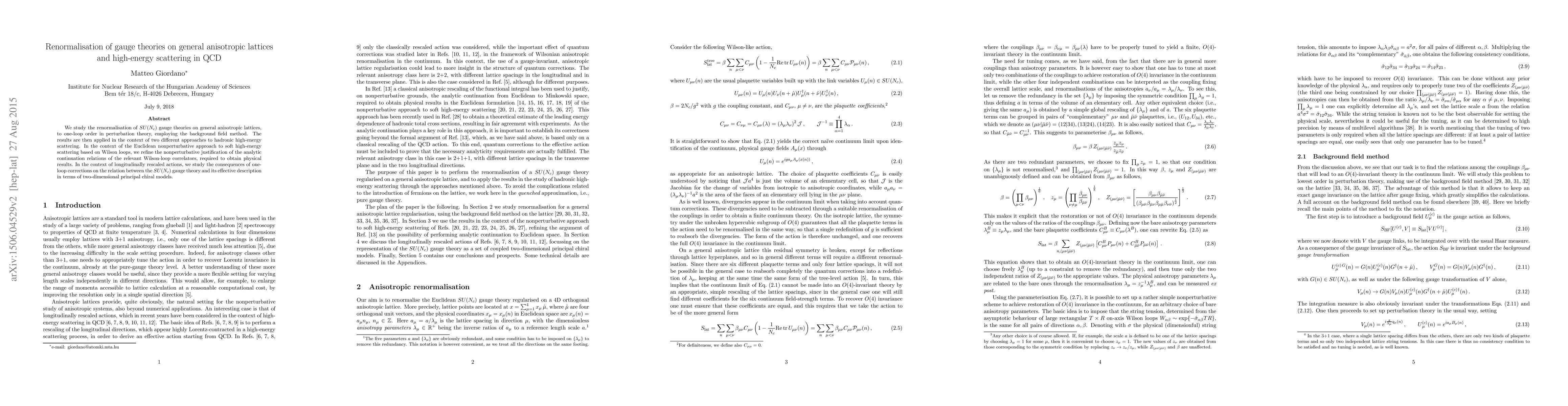 We study the renormalisation of $SU(N_c)$ gauge theories on general anisotropic lattices, to one-loop order in perturbation theory, employing the background field method. The results are then applied in the context of two different approaches to hadronic high-energy scattering. In the context of the Euclidean nonperturbative approach to soft high-energy scattering based on Wilson loops, we refine the nonperturbative justification of the analytic continuation relations of the relevant Wilson-loop correlators, required to obtain physical results. In the context of longitudinally-rescaled actions, we study the consequences of one-loop corrections on the relation between the $SU(N_c)$ gauge theory and its effective description in terms of two-dimensional principal chiral models.