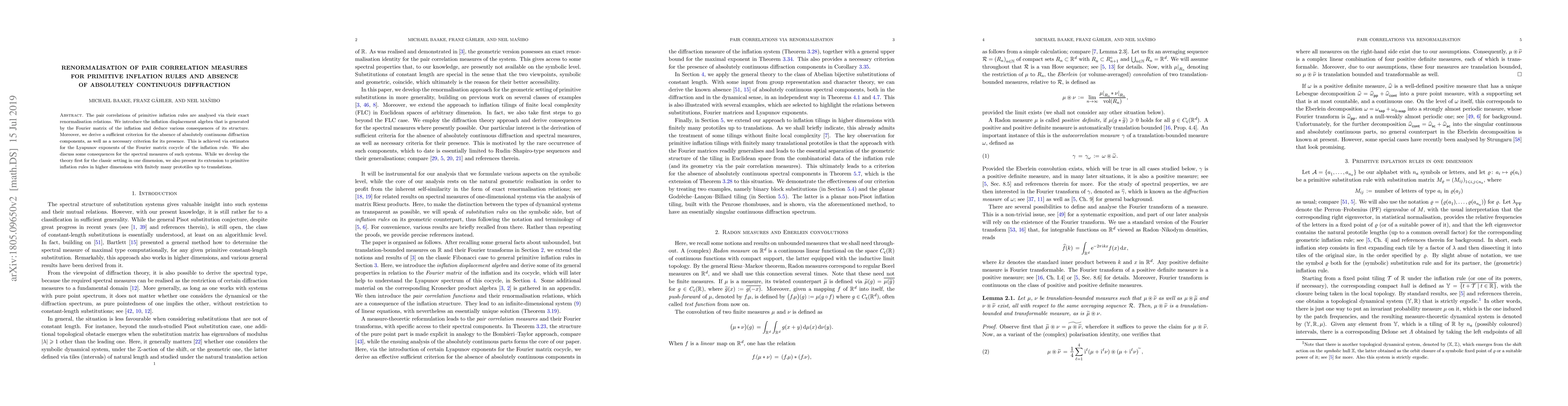 The pair correlations of primitive inflation rules are analysed via their exact renormalisation relations. We introduce the inflation displacement algebra that is generated by the Fourier matrix of the inflation and deduce various consequences of its structure. Moreover, we derive a sufficient criterion for the absence of absolutely continuous diffraction components, as well as a necessary criterion for its presence. This is achieved via estimates for the Lyapunov exponents of the Fourier matrix cocycle of the inflation rule. We also discuss some consequences for the spectral measures of such systems. While we develop the theory first for the classic setting in one dimension, we also present its extension to primitive inflation rules in higher dimensions with finitely many prototiles up to translations.