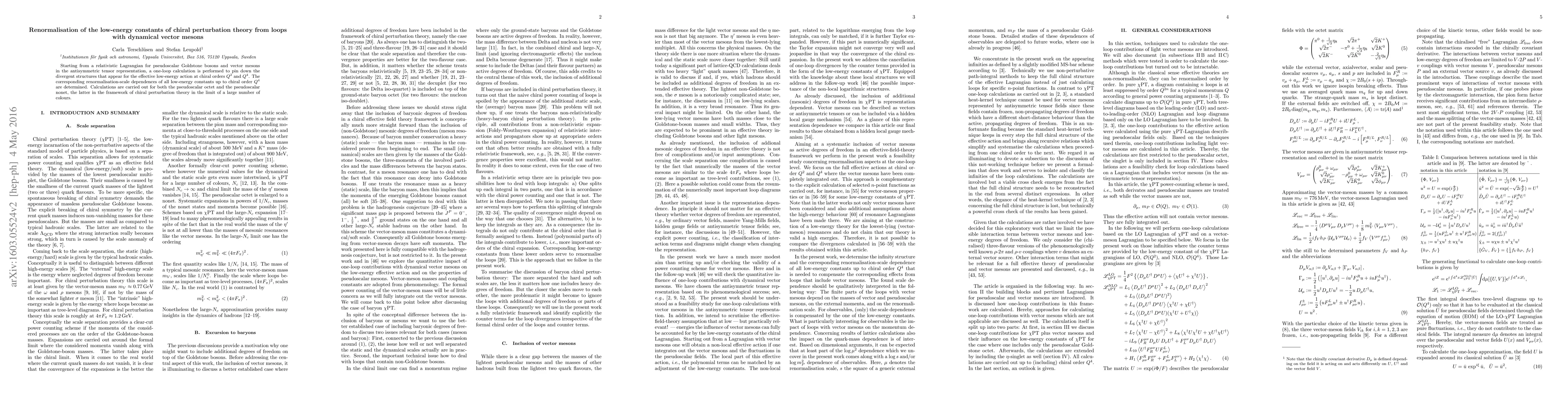 This paper renormalises low-energy constants in chiral perturbation theory by performing one-loop calculations with dynamical vector mesons, determining the renormalisation-scale dependences for both the pseudoscalar octet and nonet up to chiral order Q^4. The study employs a relativistic Lagrangian for pseudoscalar Goldstone bosons and vector mesons.