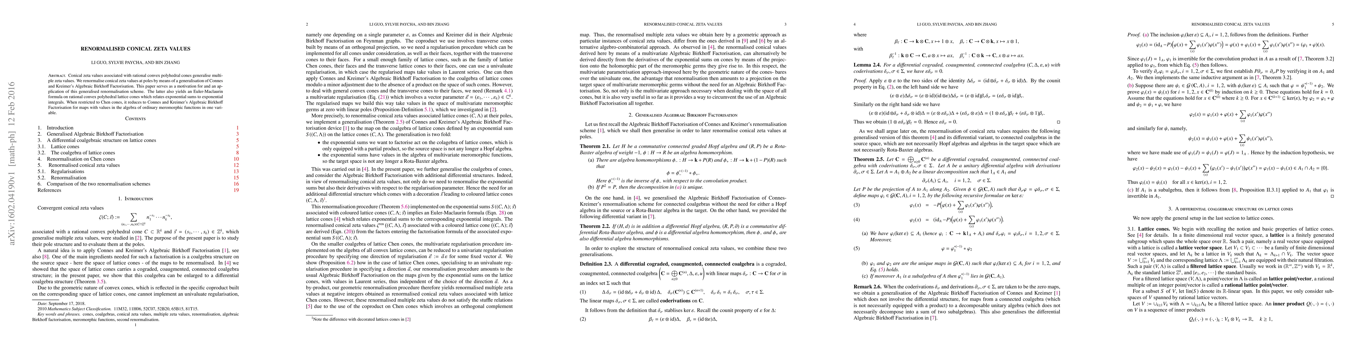 The paper employs a renormalization scheme for conical zeta values using Algebraic Birkhoff Factorization, extending Connes and Kreimer's work to rational convex polyhedral cones, and introduces an Euler-Maclaurin formula for lattice cones.