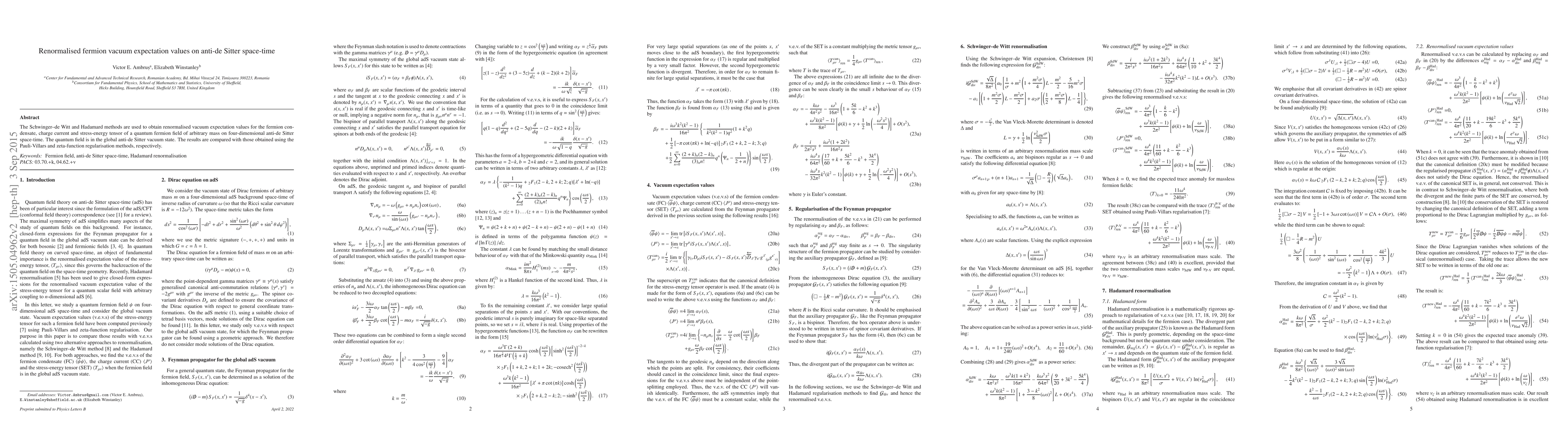 The paper renormalises vacuum expectation values for a quantum fermion field on four-dimensional anti-de Sitter space-time using the Schwinger-de Witt and Hadamard methods, comparing the results with Pauli-Villars and zeta-function regularisation techniques. These calculations pertain to the fermion condensate, charge current, and stress-energy tensor.