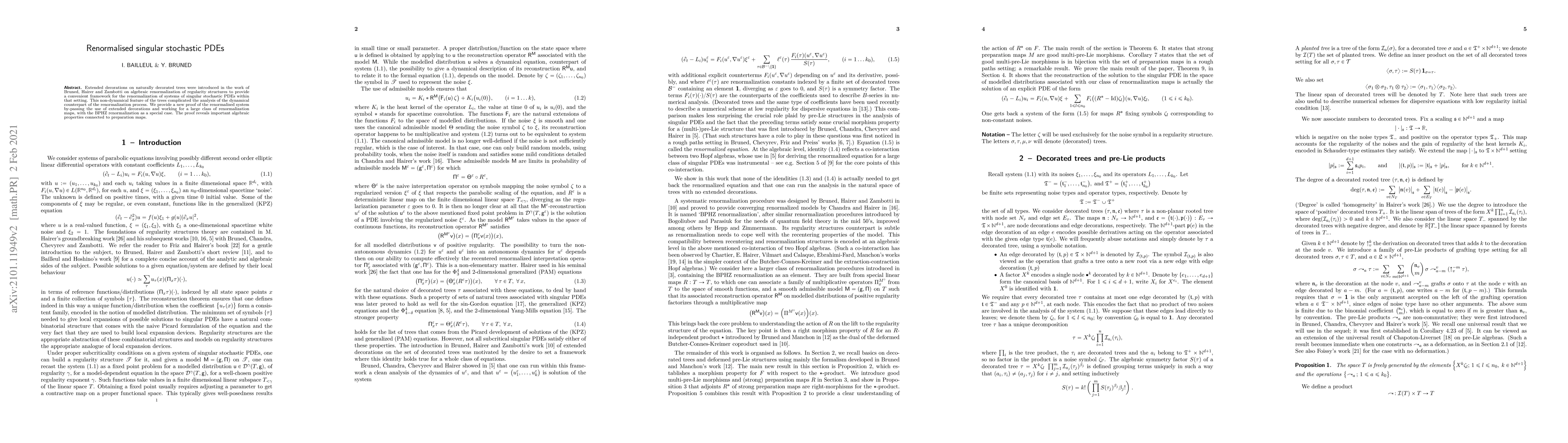 Extended decorations on naturally decorated trees were introduced in the work of Bruned, Hairer and Zambotti on algebraic renormalization of regularity structures to provide a convenient framework for the renormalization of systems of singular stochastic PDEs within that setting. This non-dynamical feature of the trees complicated the analysis of the dynamical counterpart of the renormalization process. We provide a new proof of the renormalized system by-passing the use of extended decorations and working for a large class of renormalization maps, with the BPHZ renormalization as a special case. The proof reveals important algebraic properties connected to preparation maps.
