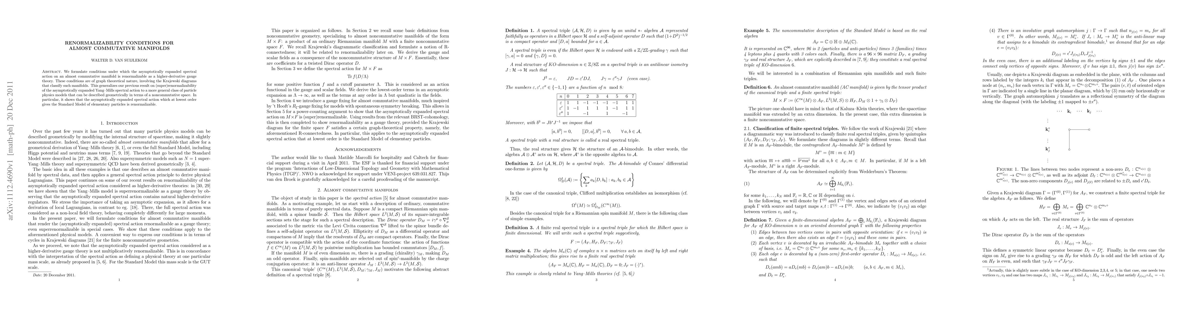 We formulate conditions under which the asymptotically expanded spectral action on an almost commutative manifold is renormalizable as a higher-derivative gauge theory. These conditions are of graph theoretical nature, involving the Krajewski diagrams that classify such manifolds. This generalizes our previous result on (super)renormalizability of the asymptotically expanded Yang-Mills spectral action to a more general class of particle physics models that can be described geometrically in terms of a noncommutative space. In particular, it shows that the asymptotically expanded spectral action which at lowest order gives the Standard Model of elementary particles is renormalizable.