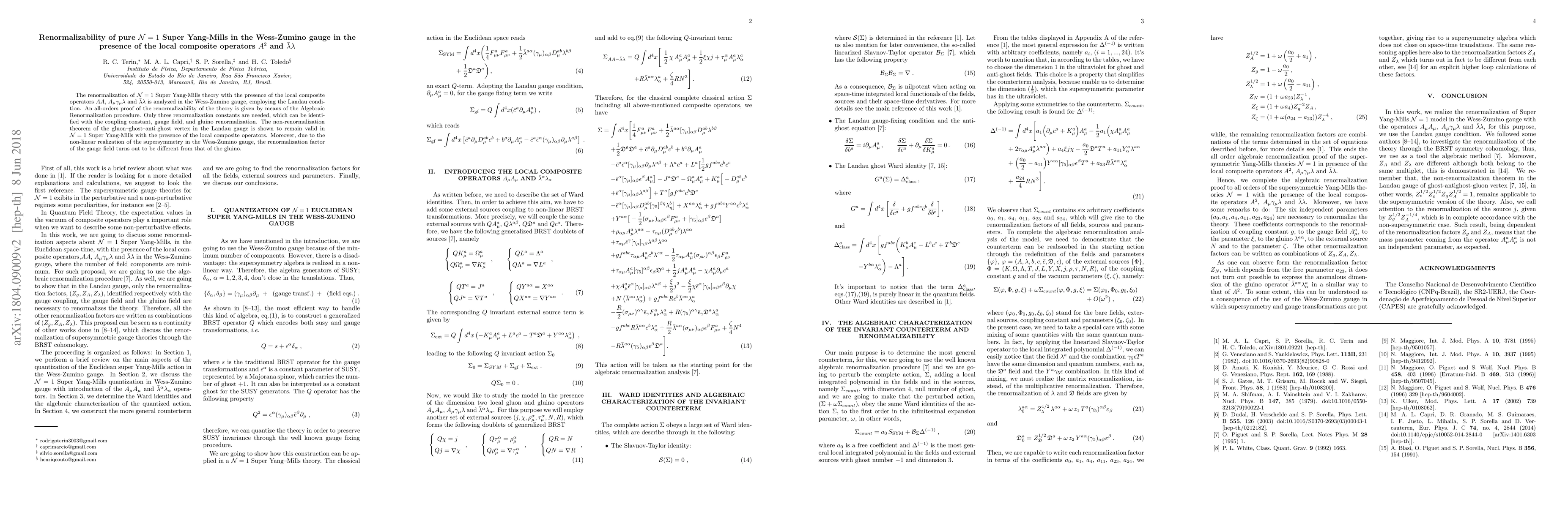Summary: This paper proves the renormalizability of $\mathcal{N}=1$ Super Yang-Mills theory in the Wess-Zumino gauge using Algebraic Renormalization, showing only three renormalization constants are needed. The non-renormalization theorem for the gluon-ghost-anti-ghost vertex remains valid, and the gauge field renormalization factor differs from that of the gluino due to the non-linear supersymmetry realization.