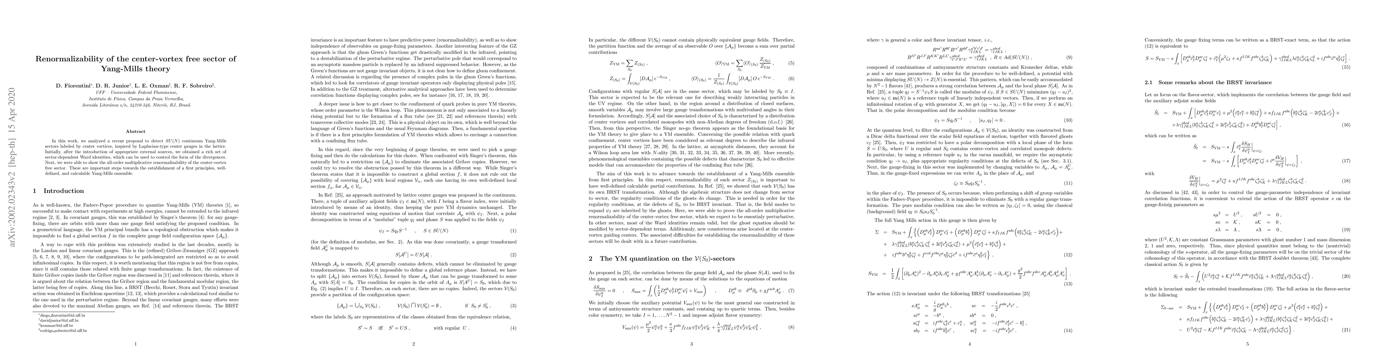 This paper investigates the renormalizability of the center-vortex free sector in $SU(N)$ Yang-Mills theory, demonstrating the all-order multiplicative renormalizability and establishing a set of sector-dependent Ward identities to manage divergences. These findings are crucial for defining a calculable Yang-Mills ensemble.