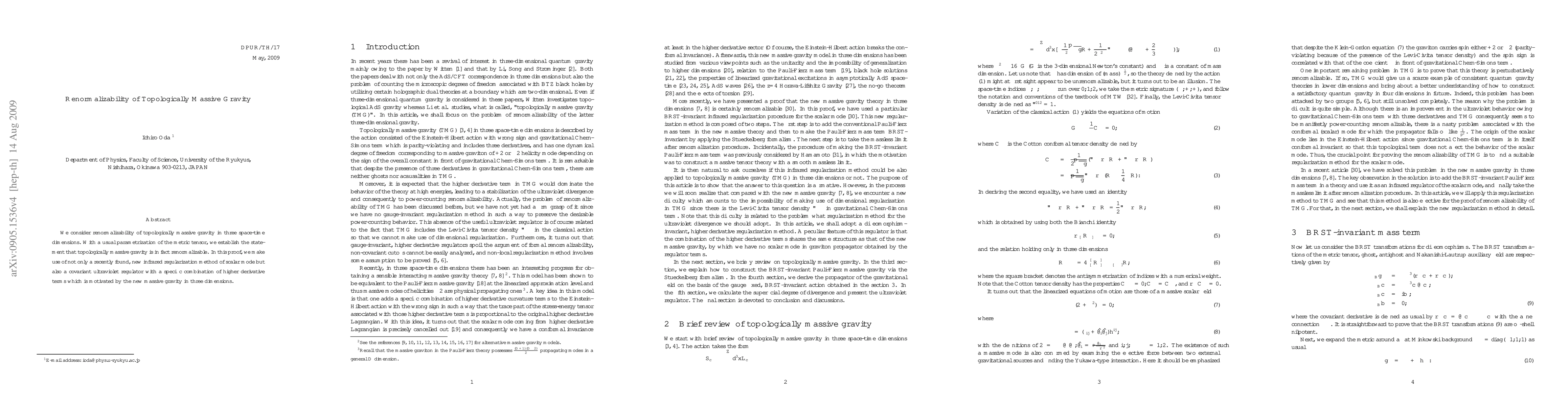 This paper demonstrates that topologically massive gravity is renormalizable in three dimensions, utilizing a novel infrared regularization method for scalar modes and a covariant ultraviolet regulator incorporating higher derivative terms inspired by new massive gravity.