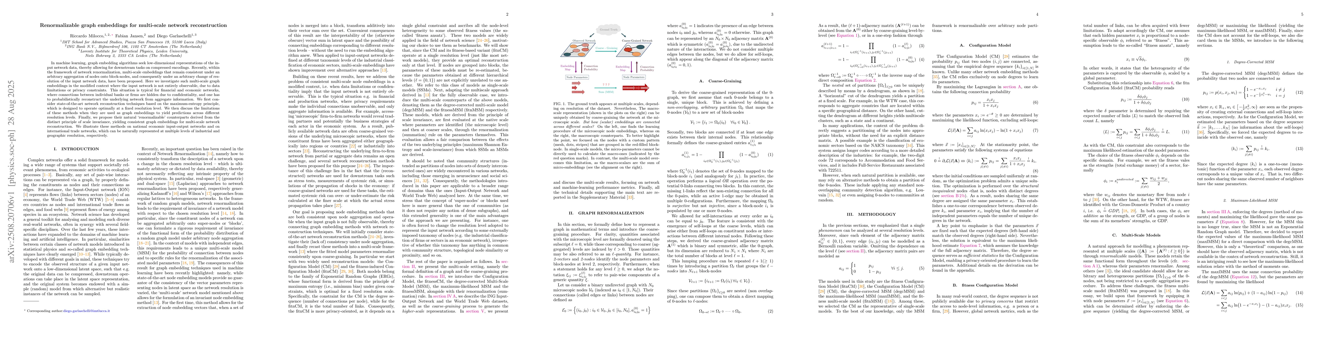 In machine learning, graph embedding algorithms seek low-dimensional representations of the input network data, thereby allowing for downstream tasks on compressed encodings. Recently, within the framework of network renormalization, multi-scale embeddings that remain consistent under an arbitrary aggregation of nodes onto block-nodes, and consequently under an arbitrary change of resolution of the input network data, have been proposed. Here we investigate such multi-scale graph embeddings in the modified context where the input network is not entirely observable, due to data limitations or privacy constraints. This situation is typical for financial and economic networks, where connections between individual banks or firms are hidden due to confidentiality, and one has to probabilistically reconstruct the underlying network from aggregate information. We first consider state-of-the-art network reconstruction techniques based on the maximum-entropy principle, which is designed to operate optimally at a fixed resolution level. We then discuss the limitations of these methods when they are used as graph embeddings to yield predictions across different resolution levels. Finally, we propose their natural 'renormalizable' counterparts derived from the distinct principle of scale invariance, yielding consistent graph embeddings for multi-scale network reconstruction. We illustrate these methods on national economic input-output networks and on international trade networks, which can be naturally represented at multiple levels of industrial and geographic resolution, respectively.
