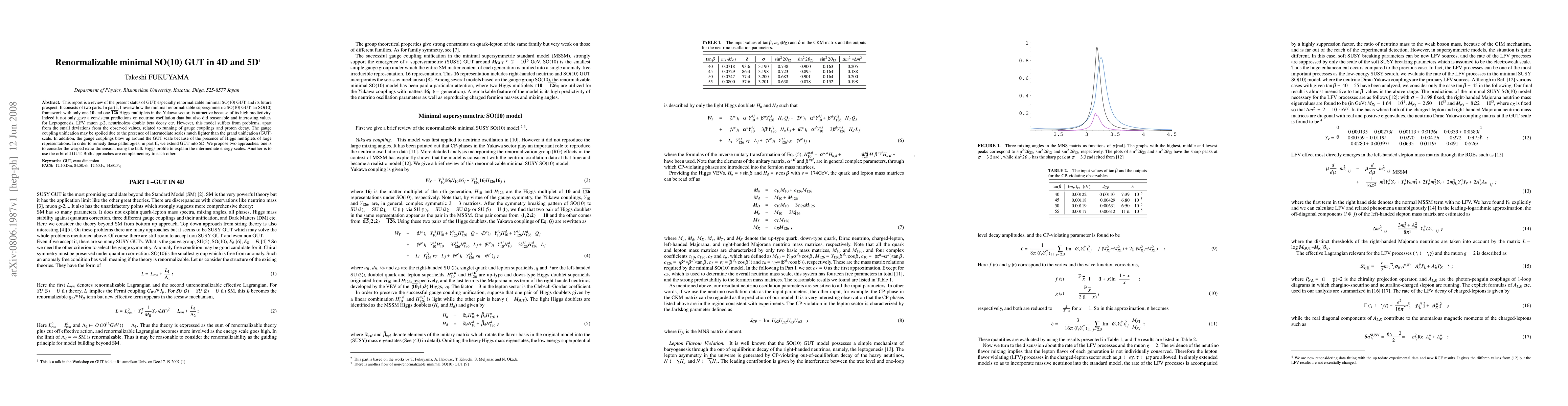 This report is a review of the present status of GUT, especially renormalizable minimal SO(10) GUT, and its future prospect. It consists of two parts. In part I, I review how the minimal renormalizable supersymmetric SO(10) GUT, an SO(10) framework with only one ${\bf 10}$ and one $\bar{\bf 126}$ Higgs multiplets in the Yukawa sector, is attractive because of its high predictivity. Indeed it not only gave a consistent predictions on neutrino oscillation data but also did reasonable and interesting values for Leptogenesis, LFV, muon g-2, neutrinoless double beta decay etc. However, this model suffers from problems, apart from the small deviations from the observed values, related to running of gauge couplings and proton decay. The gauge coupling unification may be spoiled due to the presence of intermediate scales much lighter than the grand unification (GUT) scale. In addition, the gauge couplings blow up around the GUT scale because of the presence of Higgs multiplets of large representations. In order to remedy these pathologies, in part II, we extend GUT into 5D. We propose two approaches: one is to consider the warped extra dimension, using the bulk Higgs profile to explain the intermediate energy scales. Another is to use the orbifold GUT. Both approaches are complementary to each other.