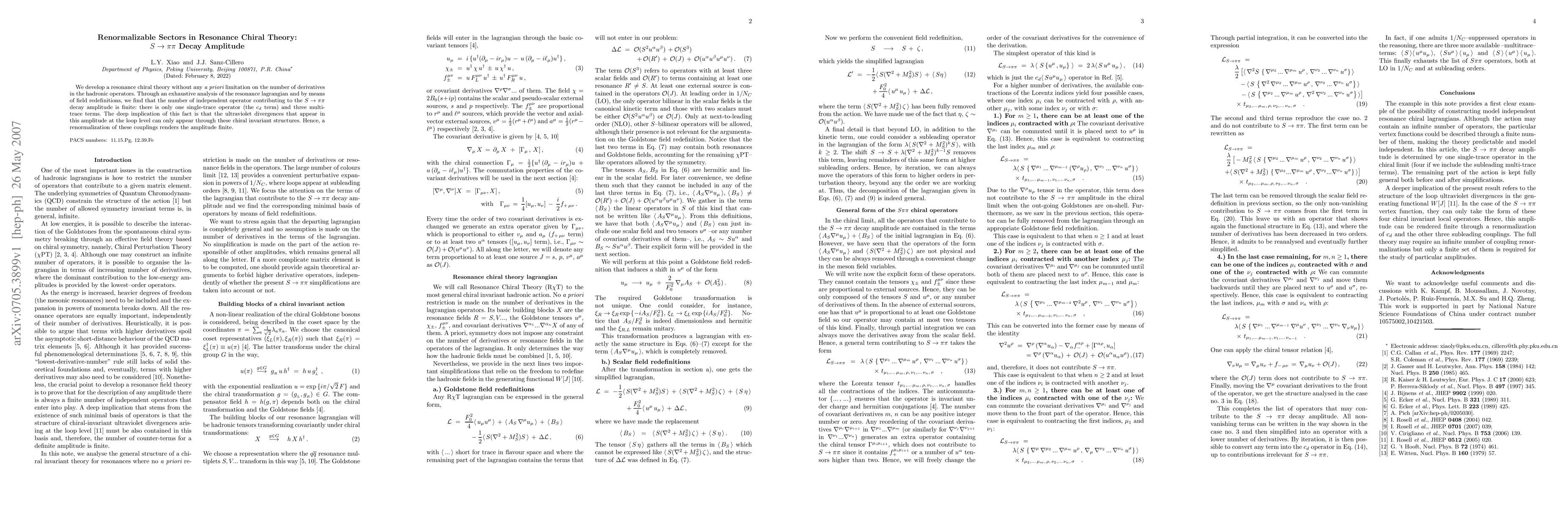 We develop a resonance chiral theory without any a priori limitation on the number of derivatives in the hadronic operators. Through an exhaustive analysis of the resonance lagrangian and by means of field redefinitions, we find that the number of independent operator contributing to the S -> pi pi decay amplitude is finite: there is only one single-trace operator (the cd term) and three multi-trace terms. The deep implication of this fact is that the ultraviolet divergences that appear in this amplitude at the loop level can only appear through these chiral invariant structures. Hence, a renormalization of these couplings renders the amplitude finite.
